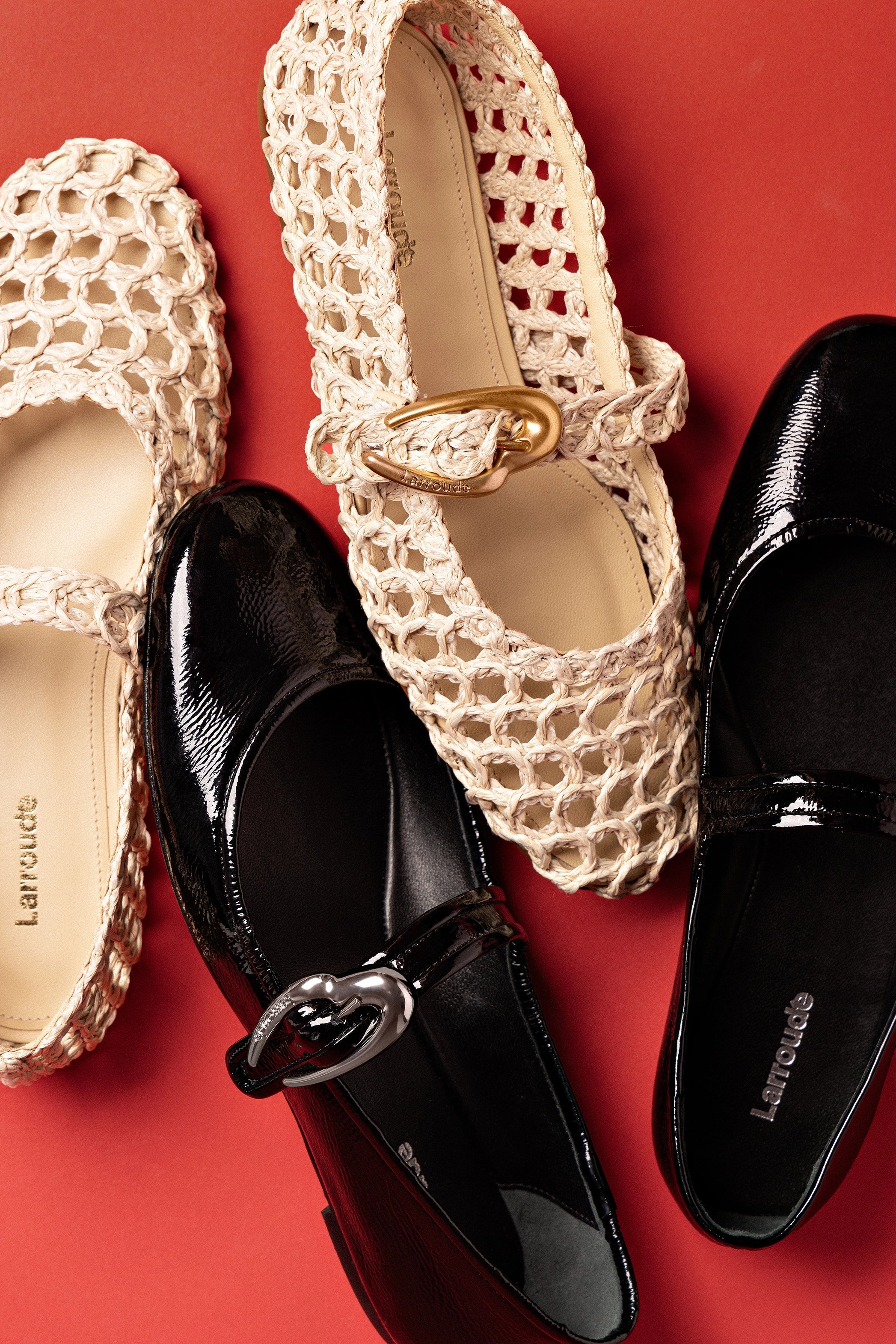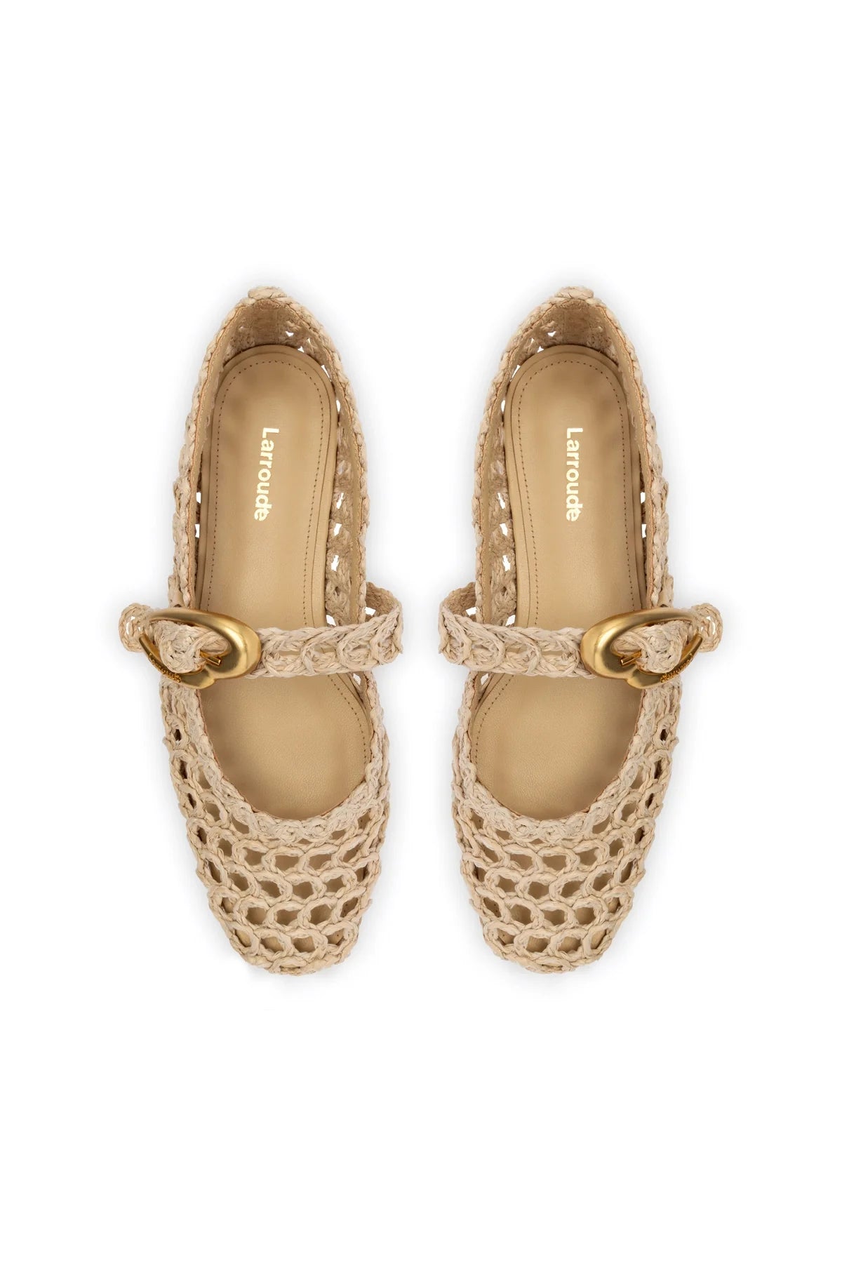 The Larroudes West Verona mary-jane draws inspiration from Shakespearean romance. Crafted with chunky woven raffia macrame and featuring a charming heart buckle on the ankle strap, this neutral pair brings a refreshing style for Spring and Summer.