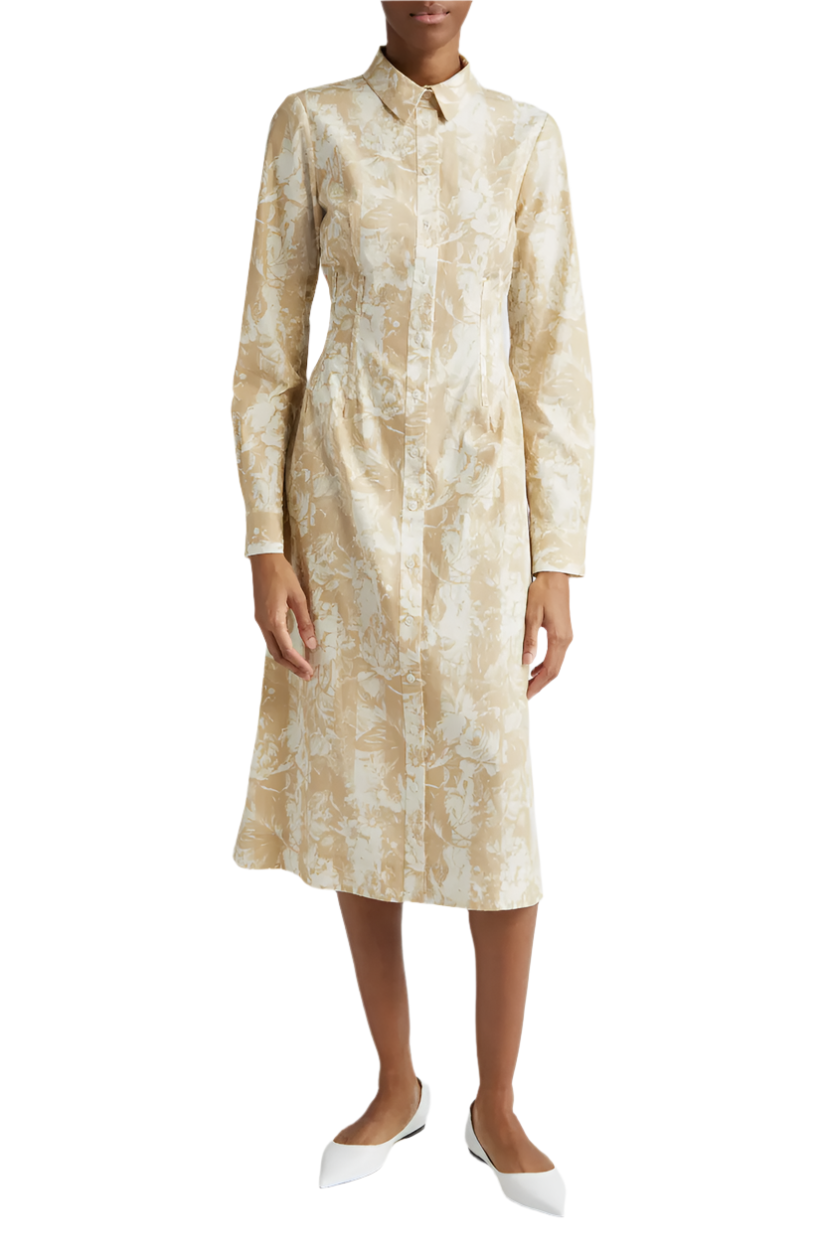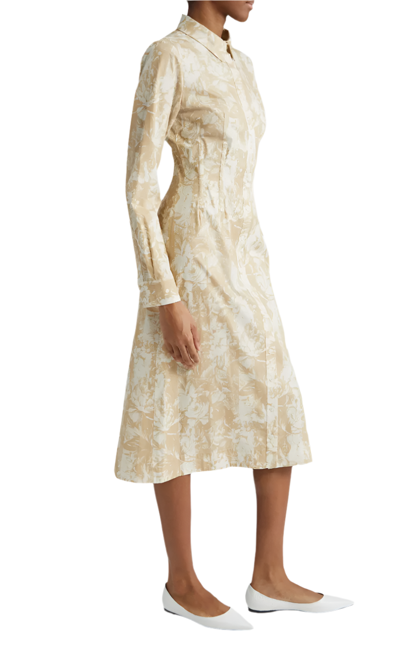 This Lela Rose midi shirtdress showcases a striped floral pattern and tailored waist darts for shape. It includes a pointed collar and buttons down the front. The dress features long sleeves with buttoned cuffs and an A-line cut. Made from cotton, it is unlined and requires dry cleaning.