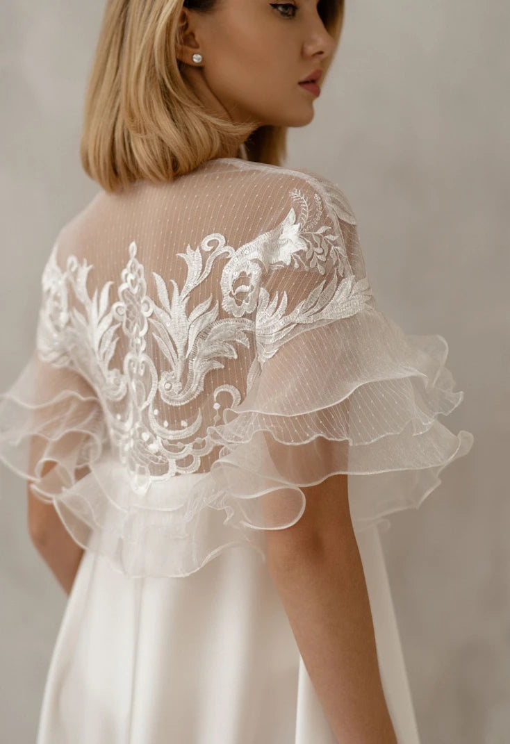 Aurelia captures the softness of the bridal morning with couture-level detail. The embroidered cape effect adds visual interest from every angle, especially in photographs, while the clean skirt keeps the silhouette refined and timeless.