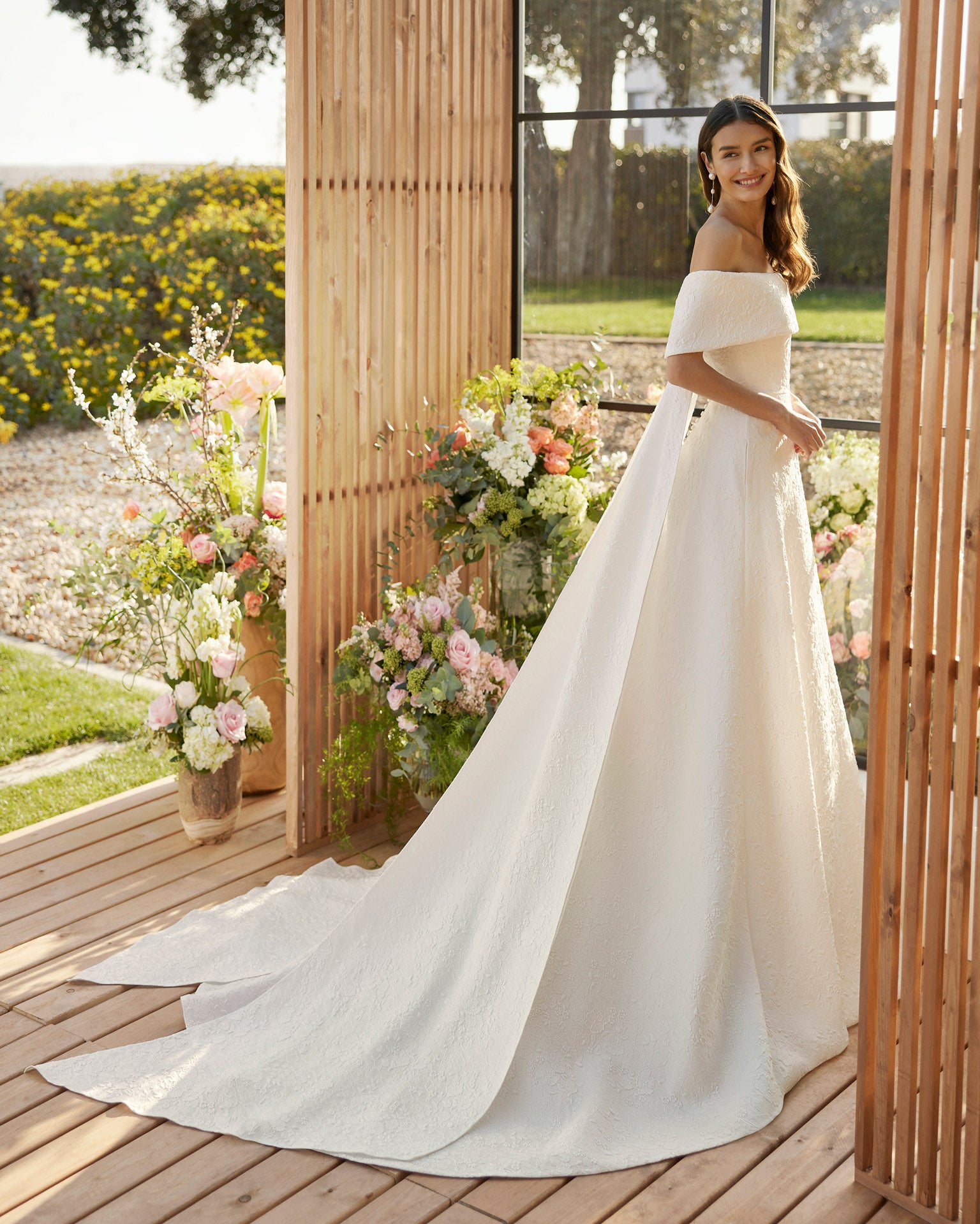 The Camir gown from Rosa Clará Couture is a masterpiece of timeless elegance and couture craftsmanship. Designed in luxurious Vera brocade, this classic three-piece A-line silhouette evokes sophistication and grace for the modern bride.