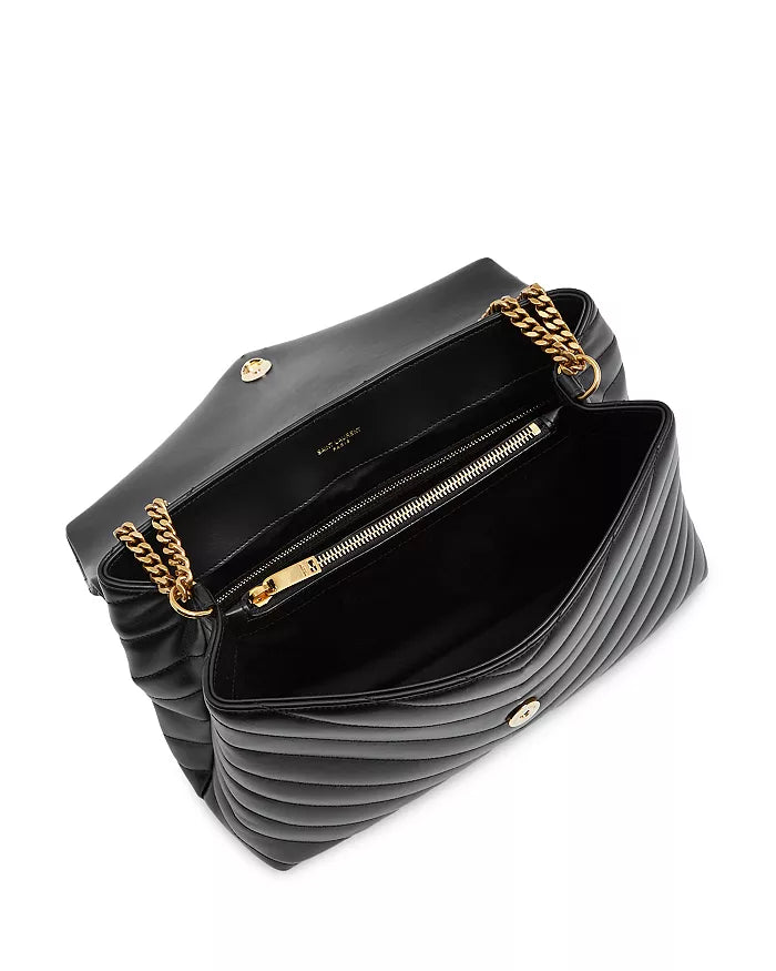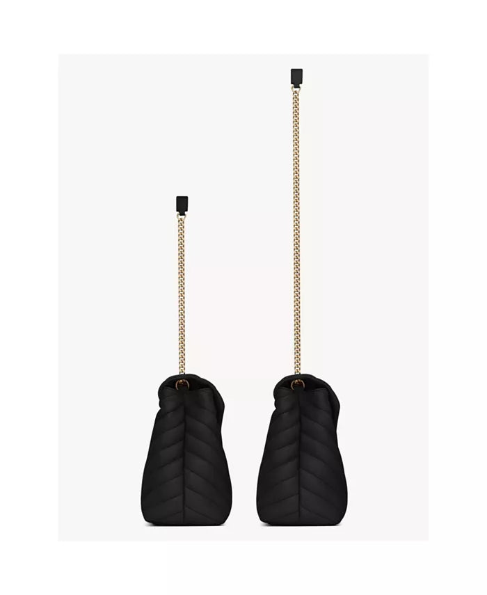 Ce petit sac Loulou signé Saint Laurent est confectionné en Italie en cuir noir et arbore l'emblématique plaque logo YSL. Son matelassage à chevrons lui confère une touche d'élégance, tandis que sa bandoulière en cuir et chaîne est à la fois confortable et chic. Son rabat à fermeture magnétique s'ouvre sur un compartiment principal doté d'une poche intérieure zippée pour un rangement sécurisé.