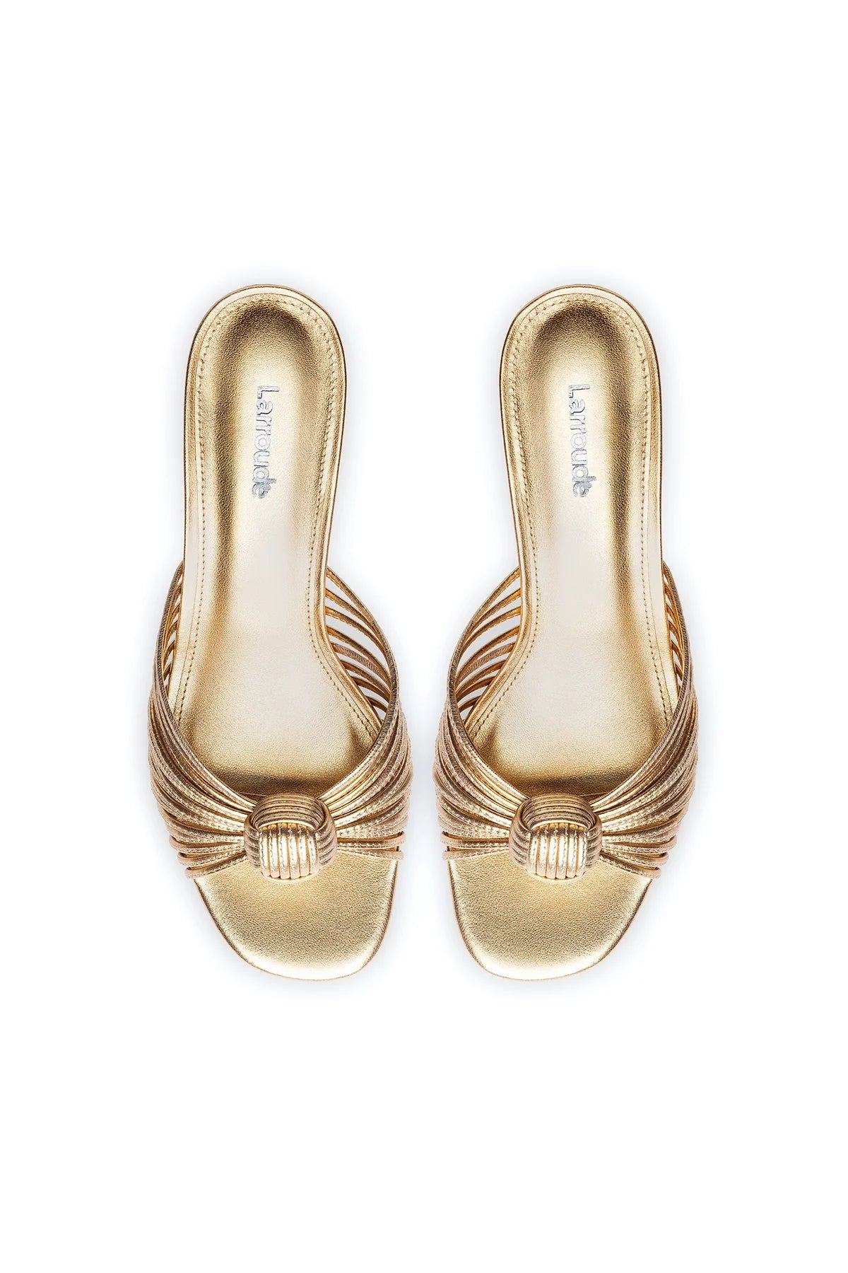 Inspired by the popular Valerie heel, this updated mule offers the same playful charm. Slip into these Larroudé gold party shoes featuring a knotted design that complements any outfit.