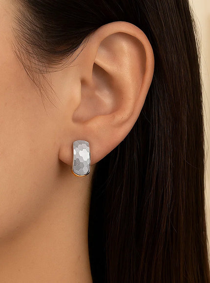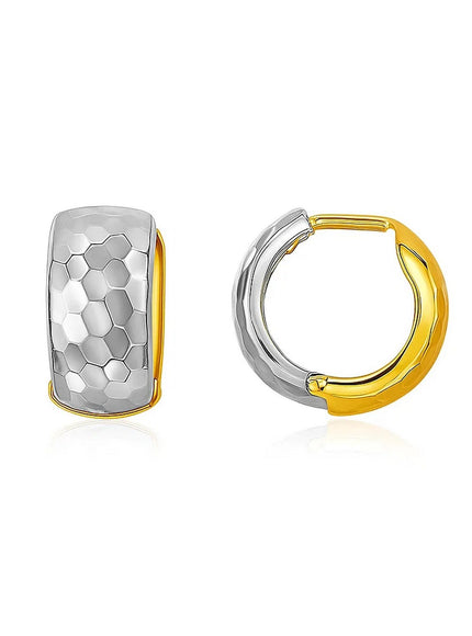 Showcasing a darling geometric texture and a contrasting polished section, these round snuggable earrings are positively gorgeous. Made of 14k yellow and white gold.