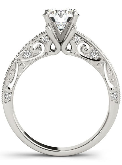 Positively elegant, this pronged round diamond ring features pave set shank stones with milgrain border detailing and baroque inspired sections. An antique set beauty made of 14k white gold.