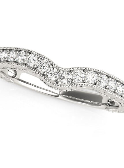Showcasing beautiful border milgrained details, this curved round diamond wedding band is positively beautiful made of 14k white gold.