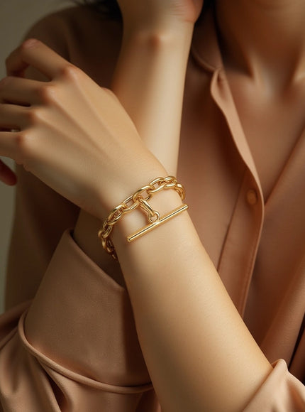Beautiful round and oval links of bright 14k yellow gold are decorated simply and beautifully with the addition of a toggle charm. Bracelet is 7 1/2 inches long and closes with a lobster clasp.