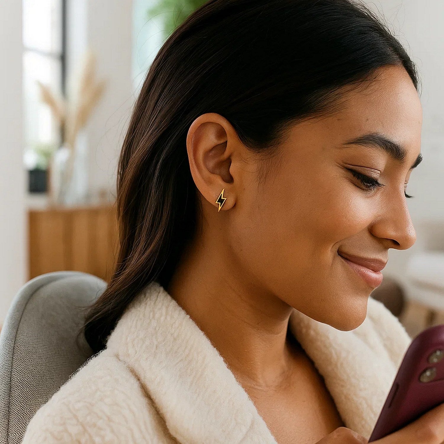 Dramatic black enameled details add contrast and power to these stunning 14k yellow gold lightning bolt earrings. Post earrings are held in place by pushback clasps.