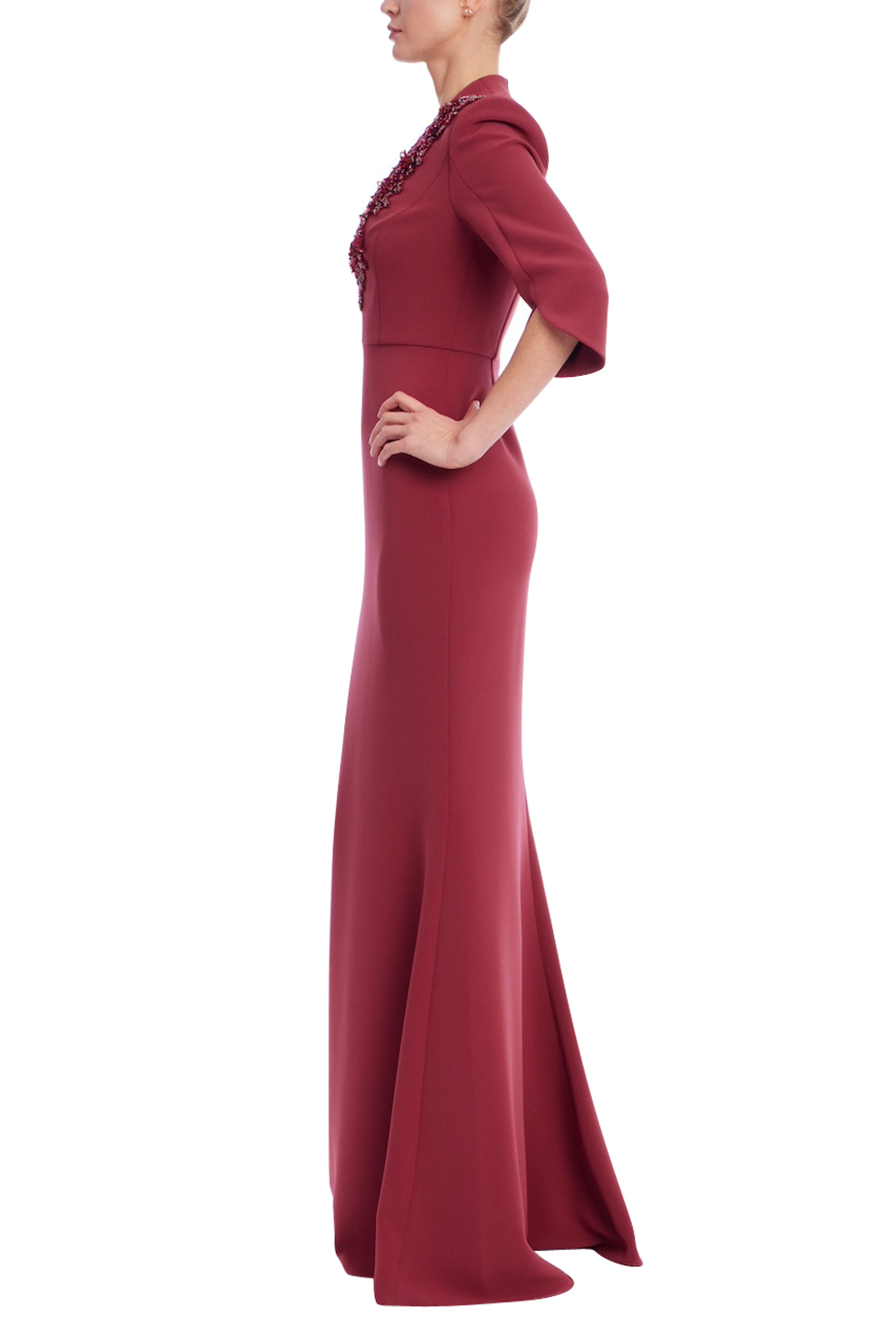 This Badgley Mischka burgundy gown delivers modern elegance with a refined, sculpted silhouette. The deep V-neckline is framed with hand-embellished floral beading, adding dimensional shimmer that draws the eye upward. Three-quarter slit sleeves create soft structure, while the smooth column skirt elongates the figure beautifully. Crafted in stretch crepe, this gown offers a sleek, flattering fit from every angle.
