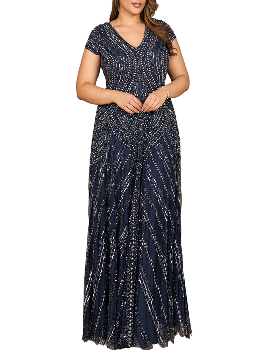 Prepare to stand out in the Lara 28952 A-Line Gown. This elegant dress features cap sleeves, detailed beadwork, and a flattering v-neckline. Ideal for mothers of the bride or groom seeking a sophisticated look. Combining beaded detail, cap-sleeve style, and classic A-line shape.