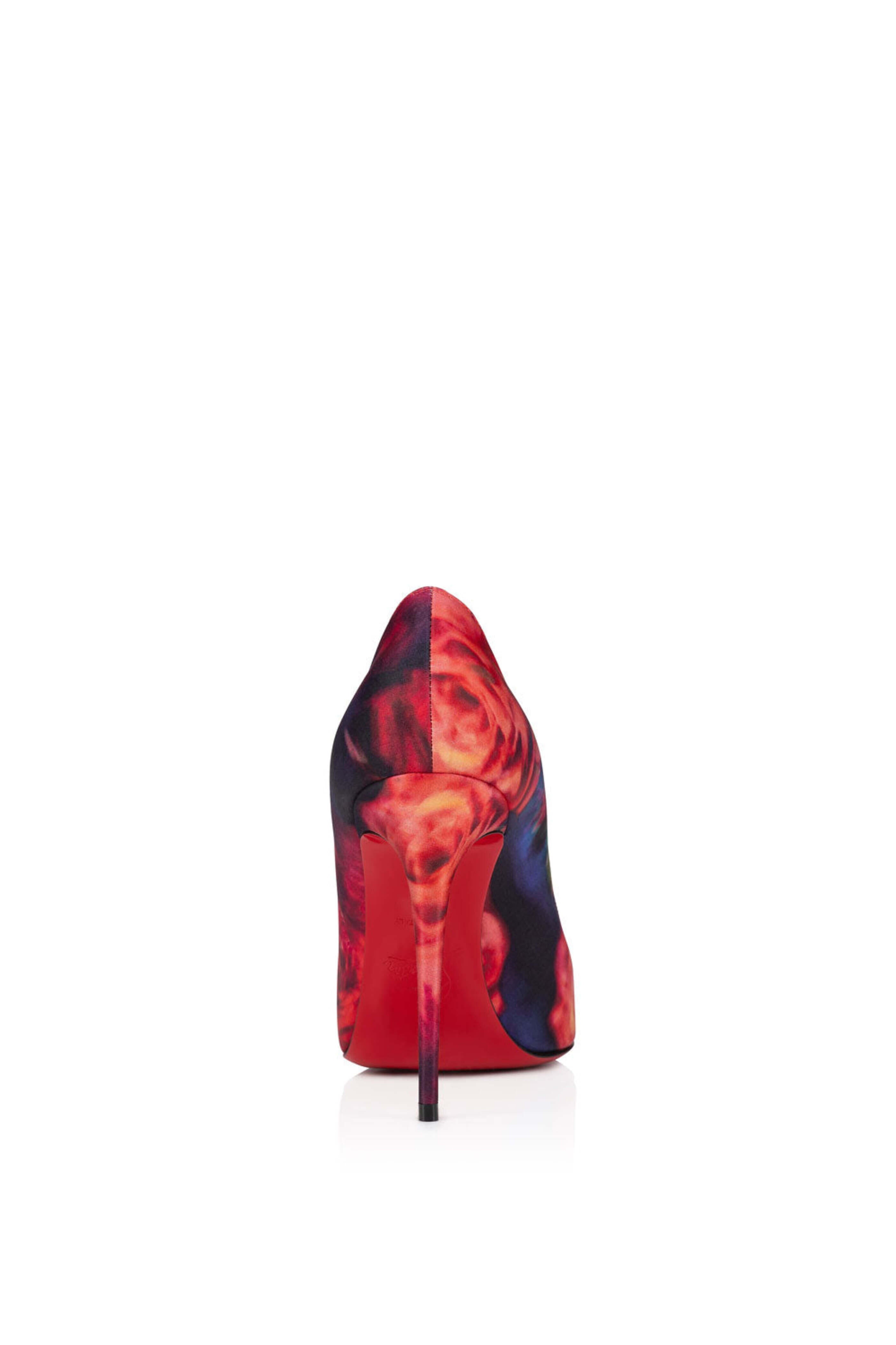 The Christian Louboutin Kate 100 Multicolor Satin Rose Pump features a pointed toe and slip-on design. It showcases a vibrant multicolored rose floral print on a crepe satin upper, complemented by a leather lining. The shoe is elevated by a 100 mm stiletto heel and finished with the iconic red leather sole. Made in Italy