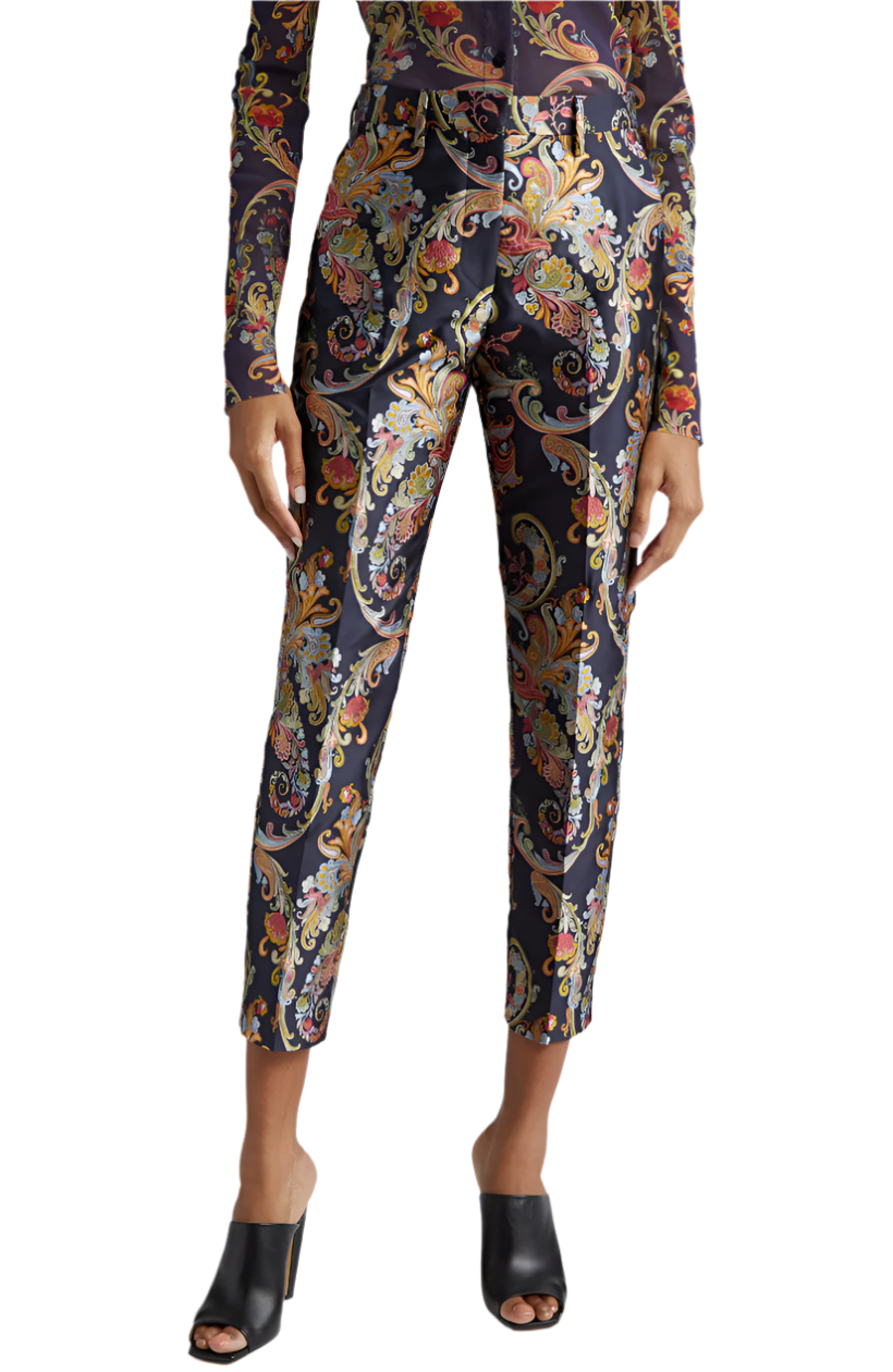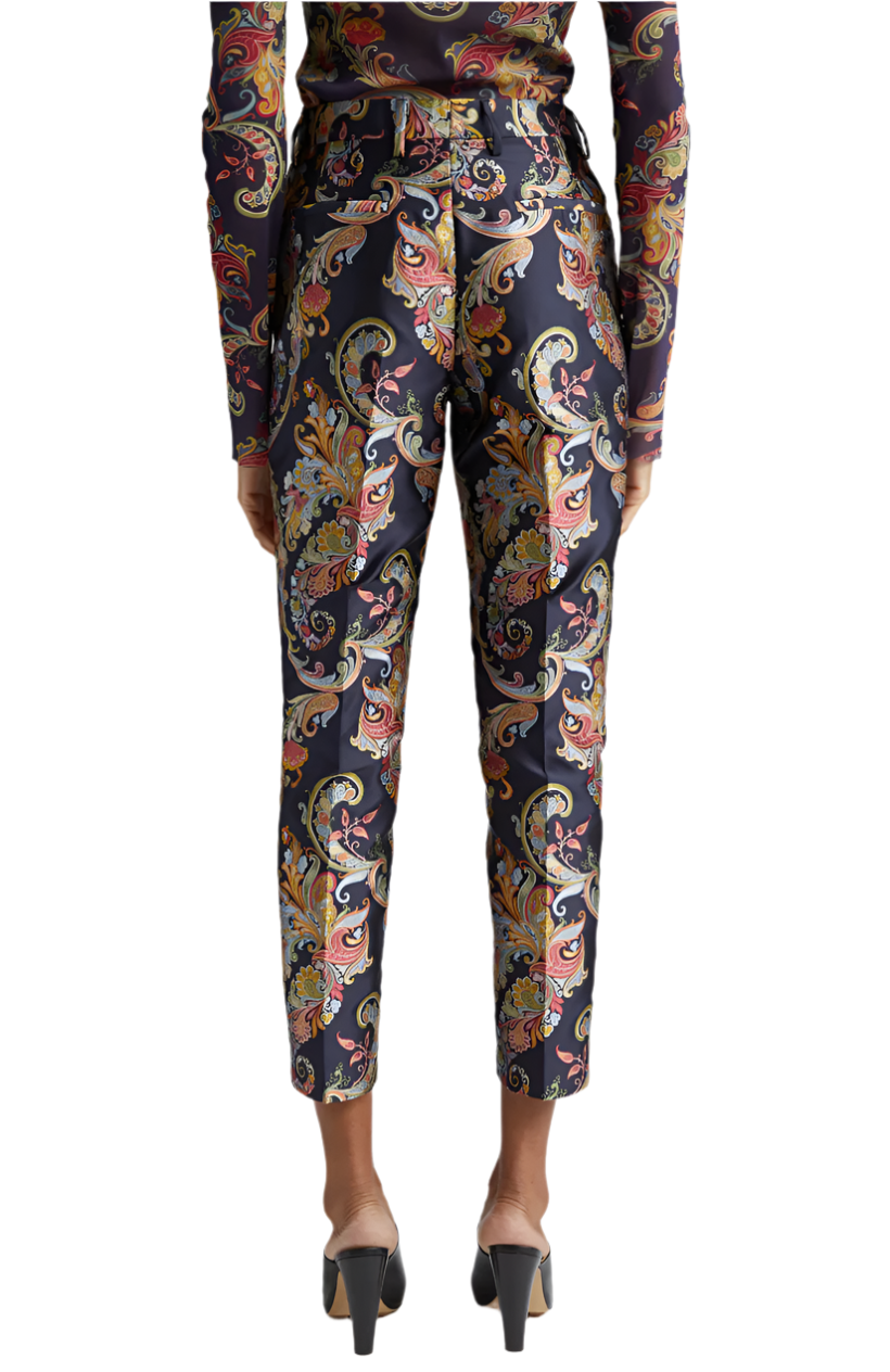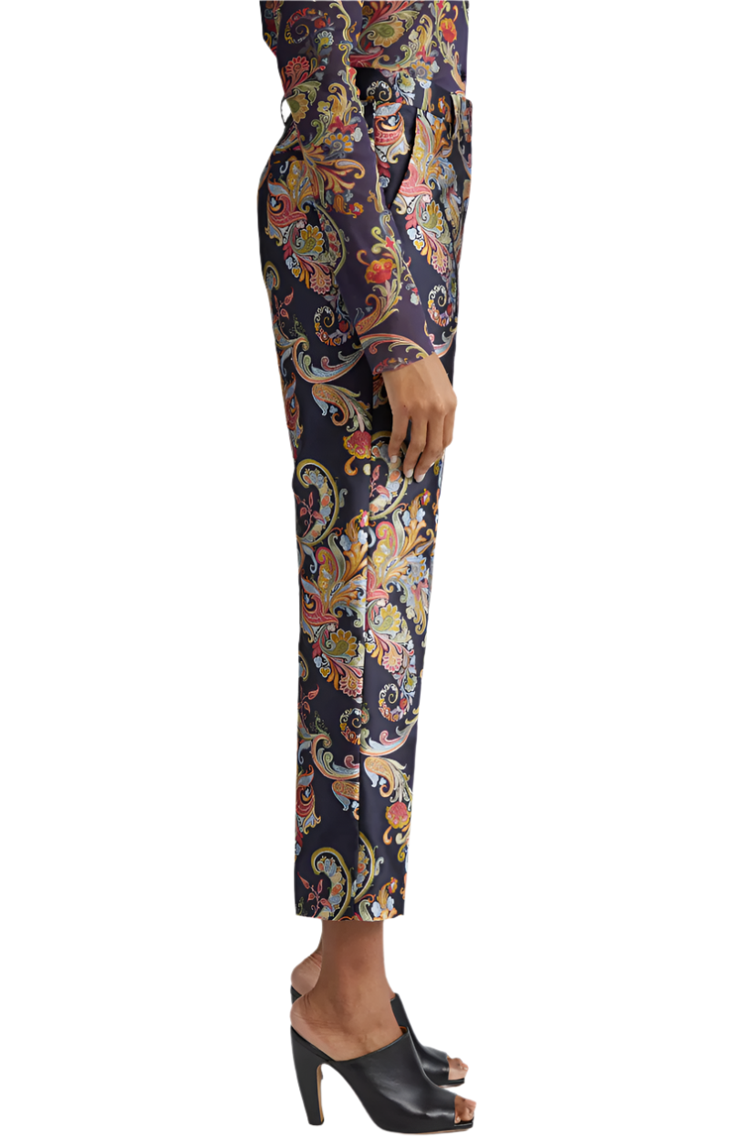 These tailored trousers from the Italian brand Etro, feature the signature paisley pattern in jewel-toned jacquard fabric. They have tapered legs cropped at the ankles, with a 27" inseam, 14" leg opening, 11" front rise, and 15" back rise (size 42 IT). The design includes a zip fly with hook-and-bar closure, front slant pockets, and back welt pockets. Made from 100% polyester, these trousers require dry cleaning and are produced in Italy.