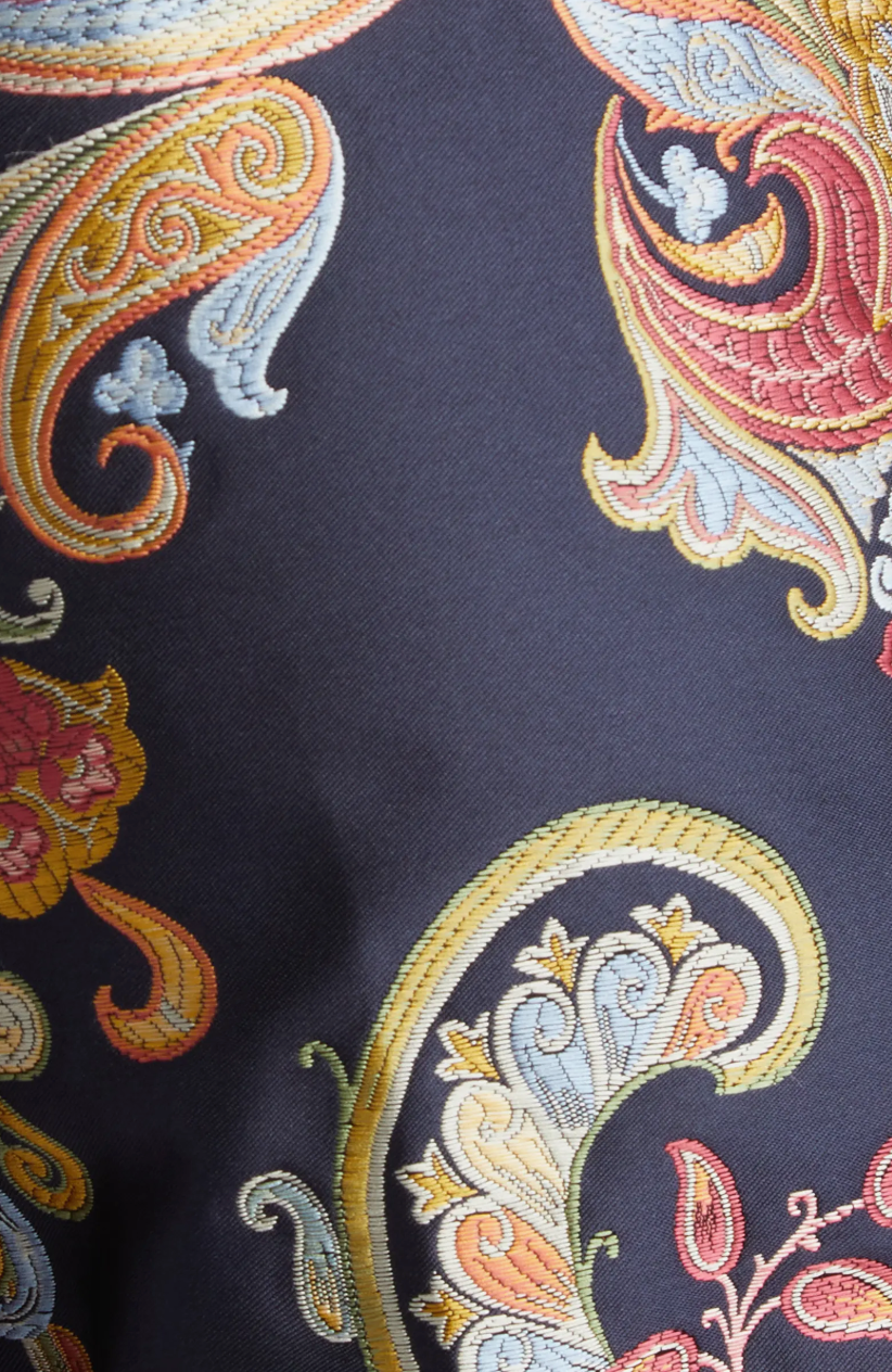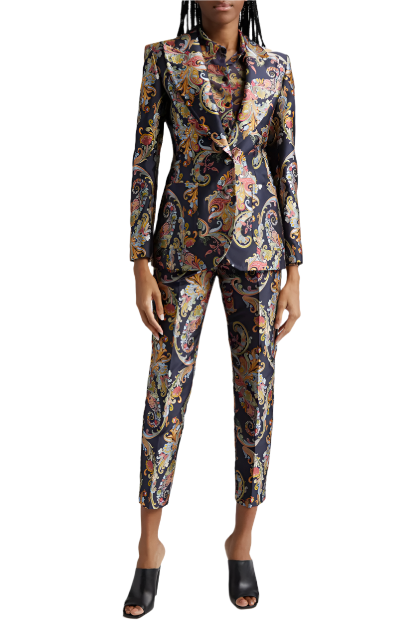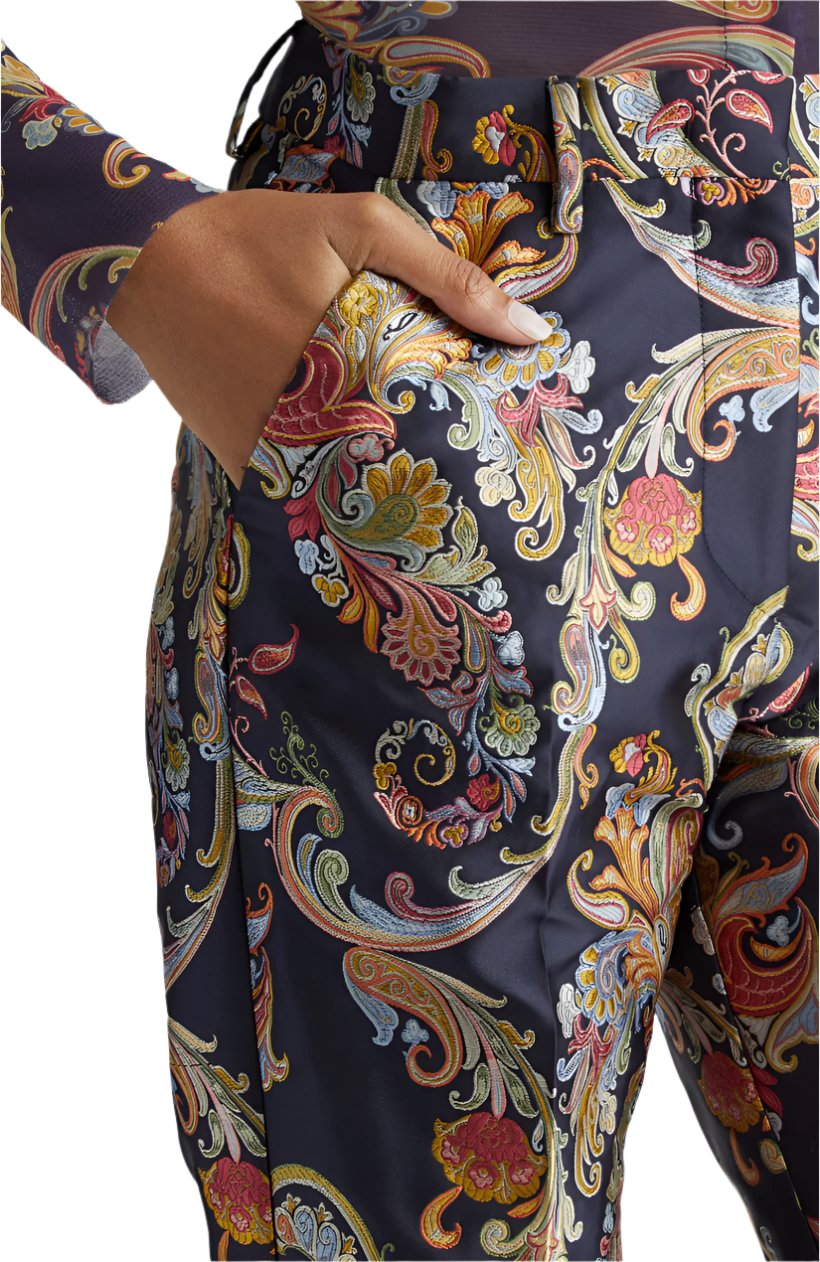 These tailored trousers from the Italian brand Etro, feature the signature paisley pattern in jewel-toned jacquard fabric. They have tapered legs cropped at the ankles, with a 27" inseam, 14" leg opening, 11" front rise, and 15" back rise (size 42 IT). The design includes a zip fly with hook-and-bar closure, front slant pockets, and back welt pockets. Made from 100% polyester, these trousers require dry cleaning and are produced in Italy.