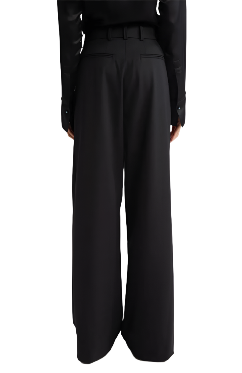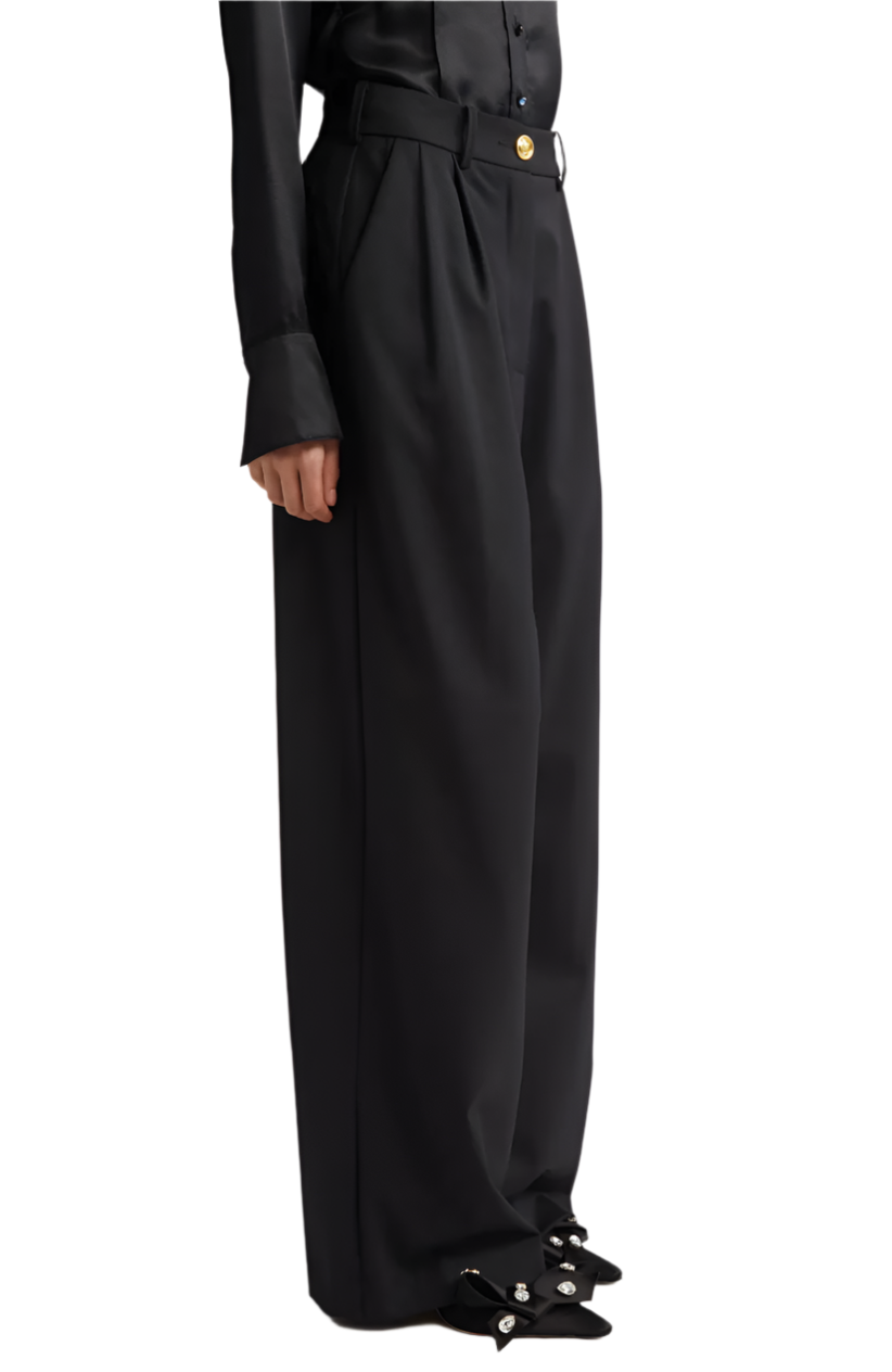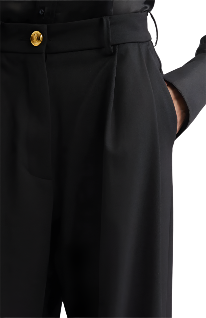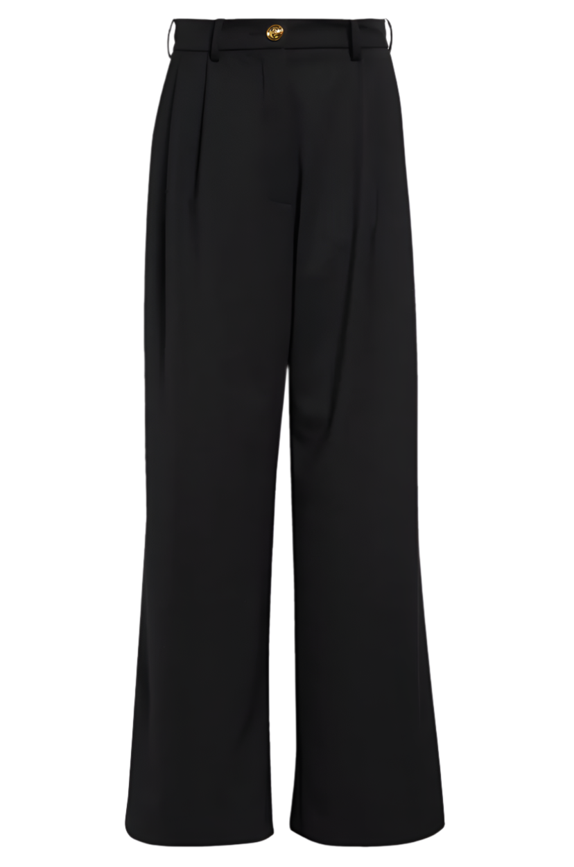 These Giambattista Valli trousers feature a pleated, wide-leg design with a high waist accented by a golden button. Crafted in Italy from a wool-rich blend of 54% polyester, 44% virgin wool, and 2% elastane, they offer a drapey silhouette. The trousers close with a zip fly and button and require dry cleaning.