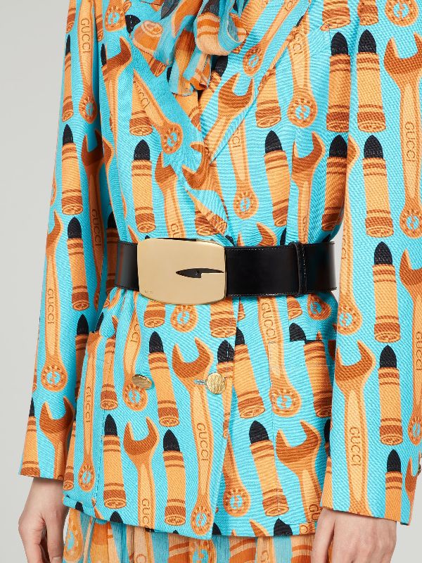 A bold statement piece from Gucci, this oversized belt is crafted from glossy black patent leather and features a striking gold-tone metal buckle in the signature G Bold shape. The wide 5 cm (approx. 2 inch) strap adds structure and presence, while the sleek rectangular buckle brings a sculptural edge. Designed with an adjustable fit, this belt elevates both formal and fashion-forward looks. Subtle Gucci branding is engraved near the buckle.