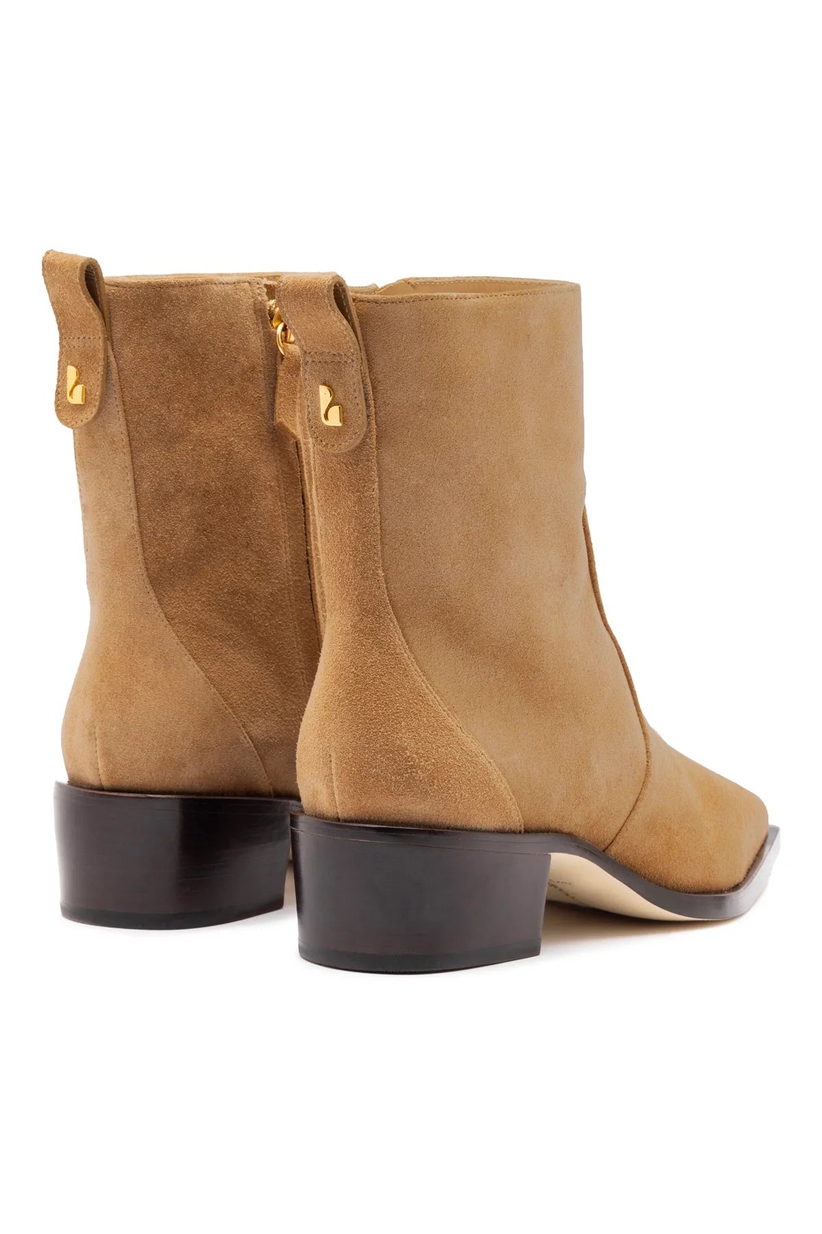 The Florencia Low Boot in Peanut Suede delivers the signature minimalist aesthetic of Larroude's beloved boot in a shorter silhouette designed for everyday wear. Constructed from soft peanut suede with a modest block heel, this boot combines understated elegance with practical comfort. Its slightly extended toe shape provides a polished, refined appearance that transitions seamlessly from midi skirts and dresses to tailored trousers, making it a versatile addition to any wardrobe.