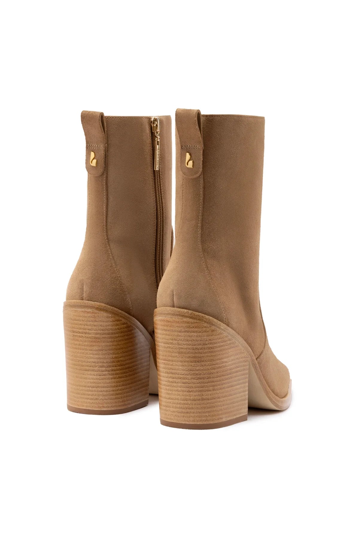 Inspired by the timeless style of James Dean, the Larroude James Bootie delivers effortless sophistication in rich peanut suede. Engineered with a precisely calibrated shaft height, these pull-on boots pair seamlessly with cropped pants and transition beautifully across seasons. Every element—from the refined fit to the signature pull-tab—reflects meticulous design craftsmanship. Versatile enough for year-round wear, these booties combine classic appeal with contemporary wearability.