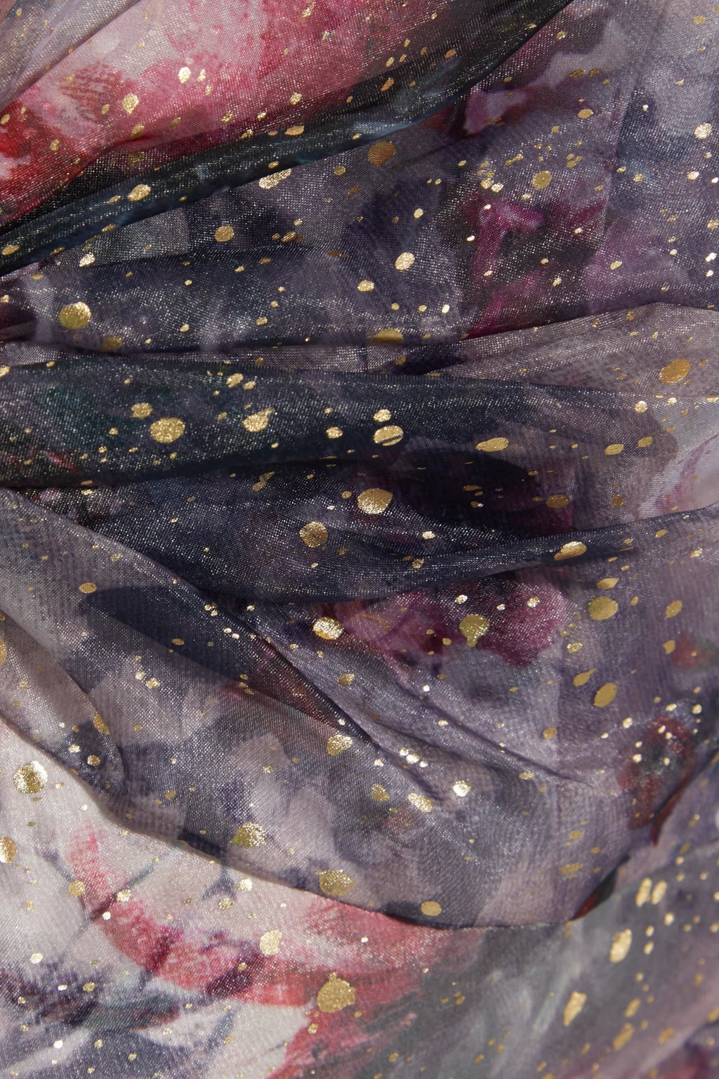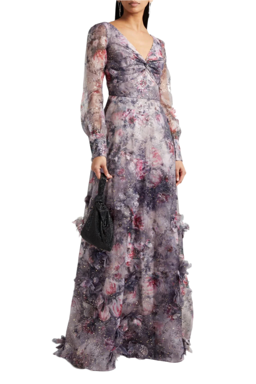 This purple floral gown from MARCHESA NOTTE features a blouson sleeve design with an all-over floral print and floral appliqué. It includes high-shine and draped detailing, a V-neckline, V-back, and a straight floor-length hem. The dress fastens with a rear zip closure.
