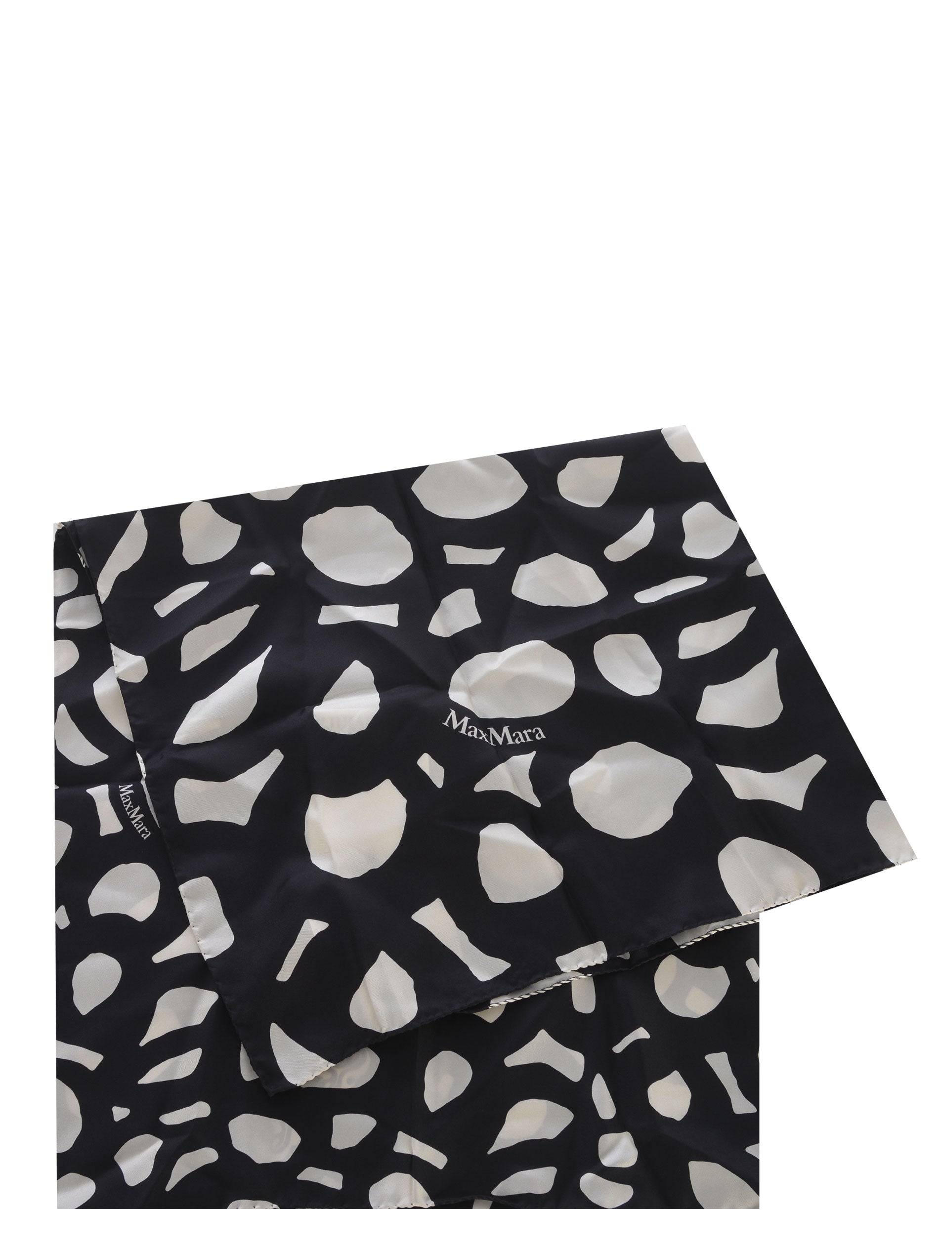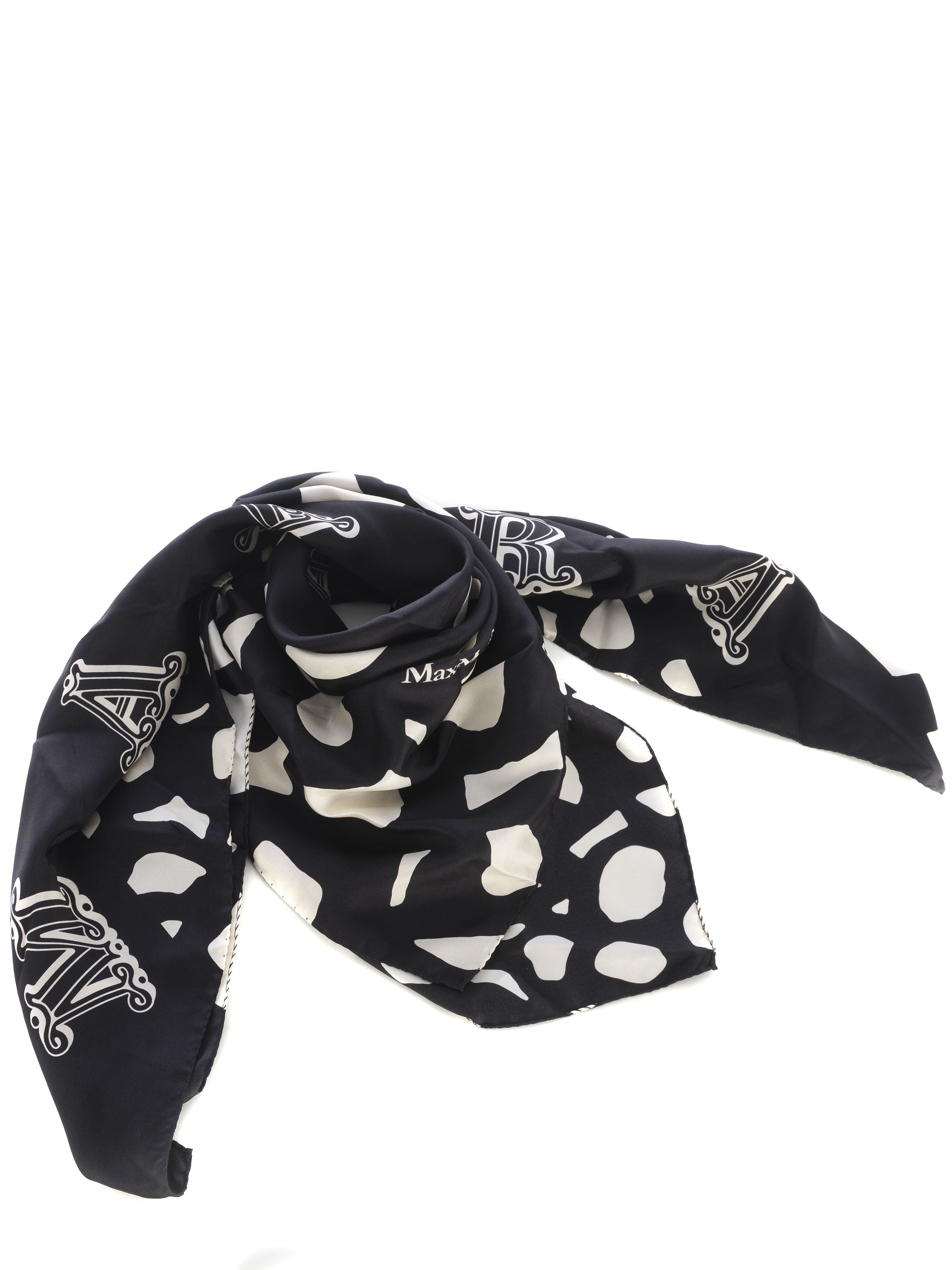 Crafted from luxurious black silk, this Max Mara "Carre90" scarf features the iconic cream-colored logo and brand lettering in an all-over patterned design. Measuring 89cm x 89cm, this Italian-made accessory combines timeless elegance with refined craftsmanship. Perfect for elevating any ensemble with understated sophistication.