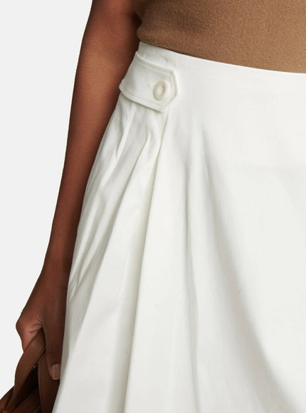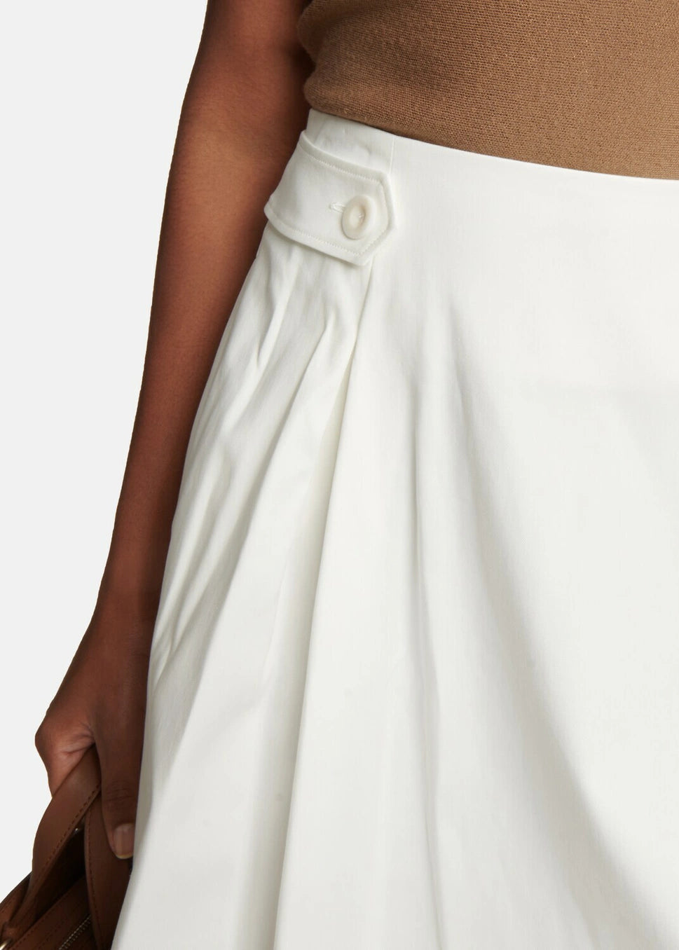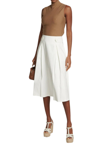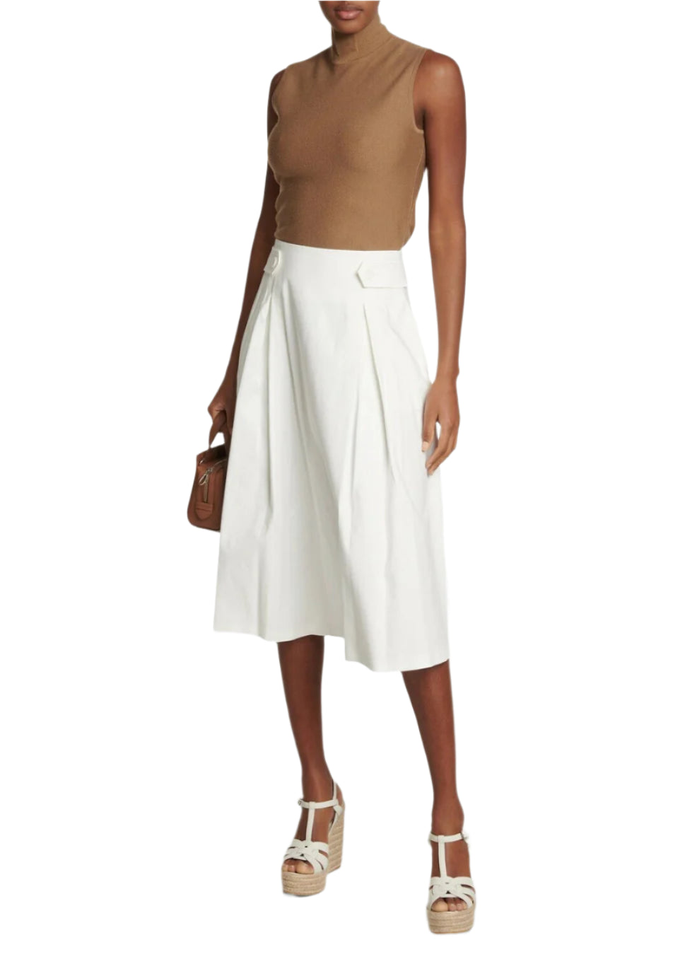 This staple skirt, made in Italy, features inverted pleats that add structure and are crafted from durable, cotton stretch fabric. Designed by Max Mara, it also includes side-seam pockets, button side tabs, and a hidden back-zip closure. Dry cleaning is recommended.