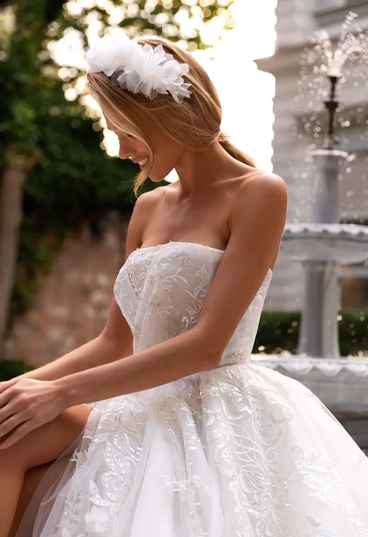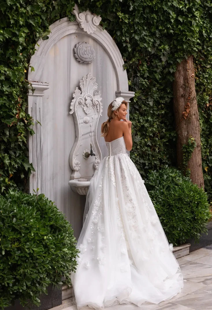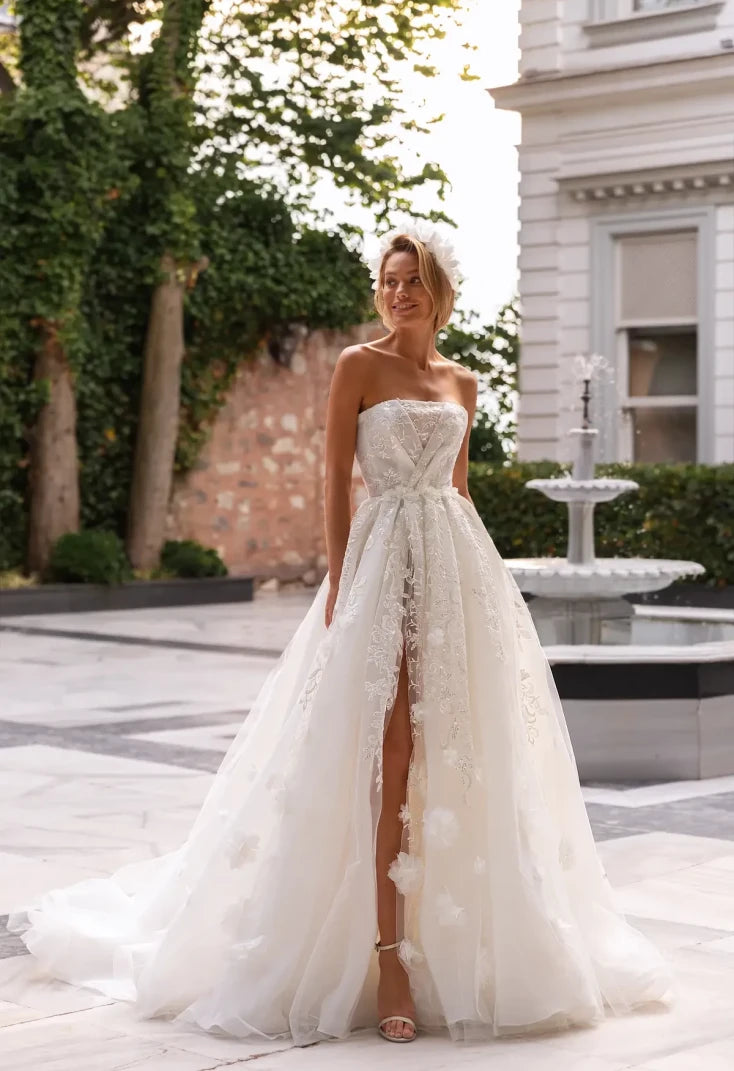 The Panakeia gown is a stunning option for brides seeking a blend of romance and modern style. Featuring intricate floral lace, dimensional appliqués, and soft tulle layers, this strapless dress has a corset-inspired bodice that accentuates the waist. Its full A-line ballgown silhouette includes a layered tulle skirt with 3D floral details and embroidered lace, complemented by a high front slit for a contemporary touch. The chapel-length train adds graceful movement, and a hidden zipper ensures a seamless finish. Perfect for spring and summer weddings or fairytale settings.