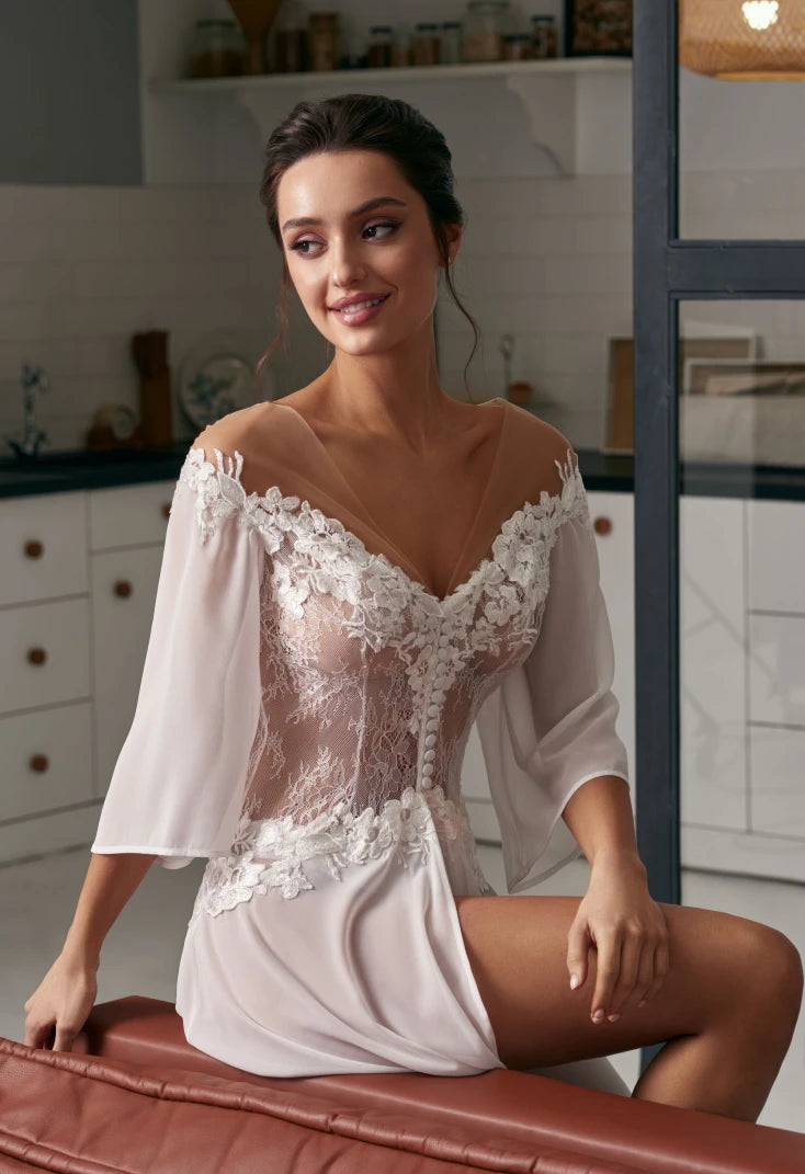 This robe balances romance with confidence. The lace bodice feels delicate and refined, while the chiffon skirt moves effortlessly with every step. It’s designed for bridal mornings but carries an understated sensuality that feels timeless rather than trend-driven.