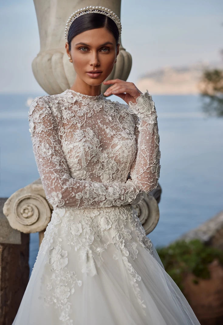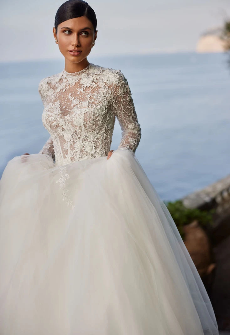 Pair with pearl drop earrings or a classic chignon to highlight the high neckline and intricate lacework. Ideal for a sophisticated garden, estate, or cathedral wedding.