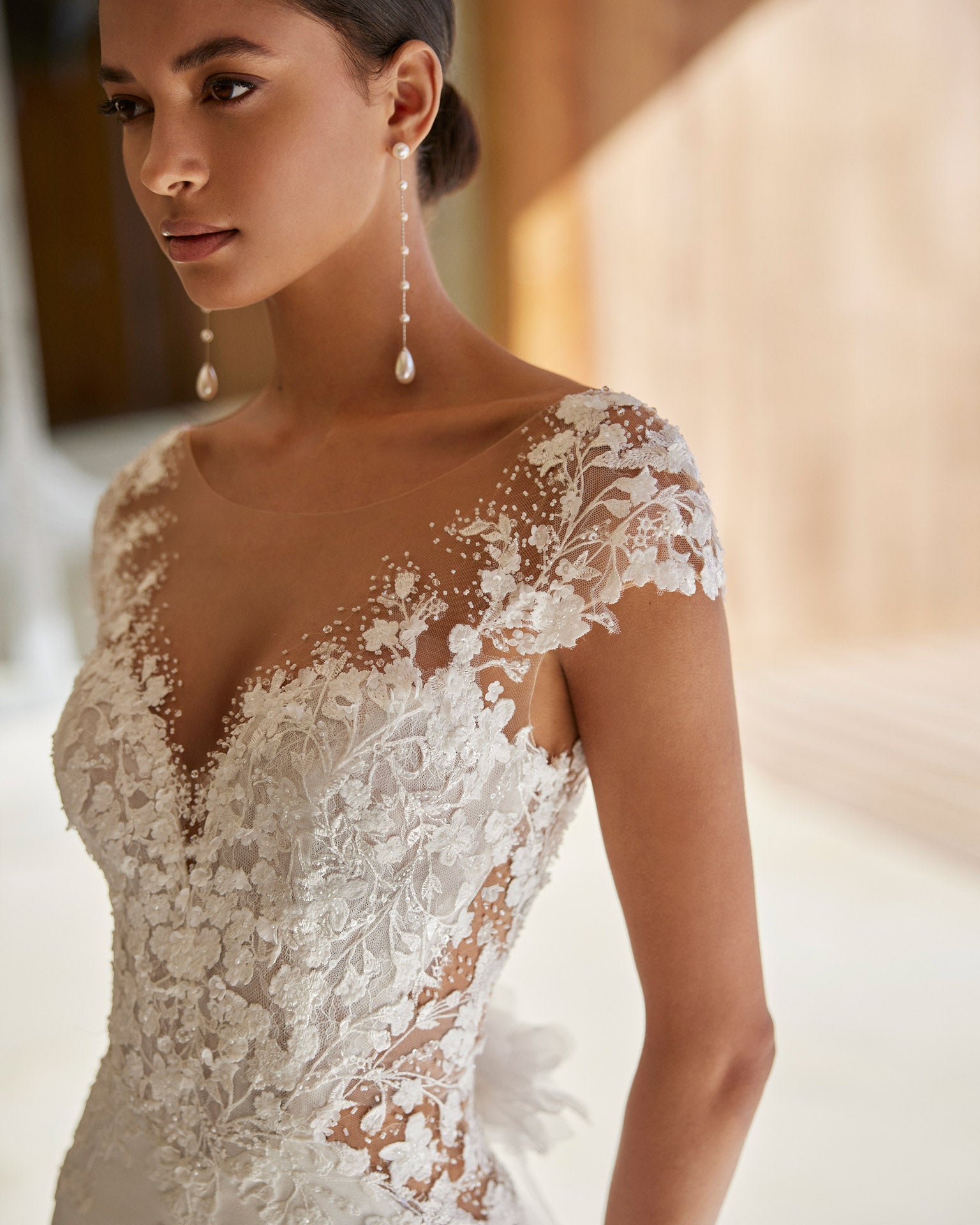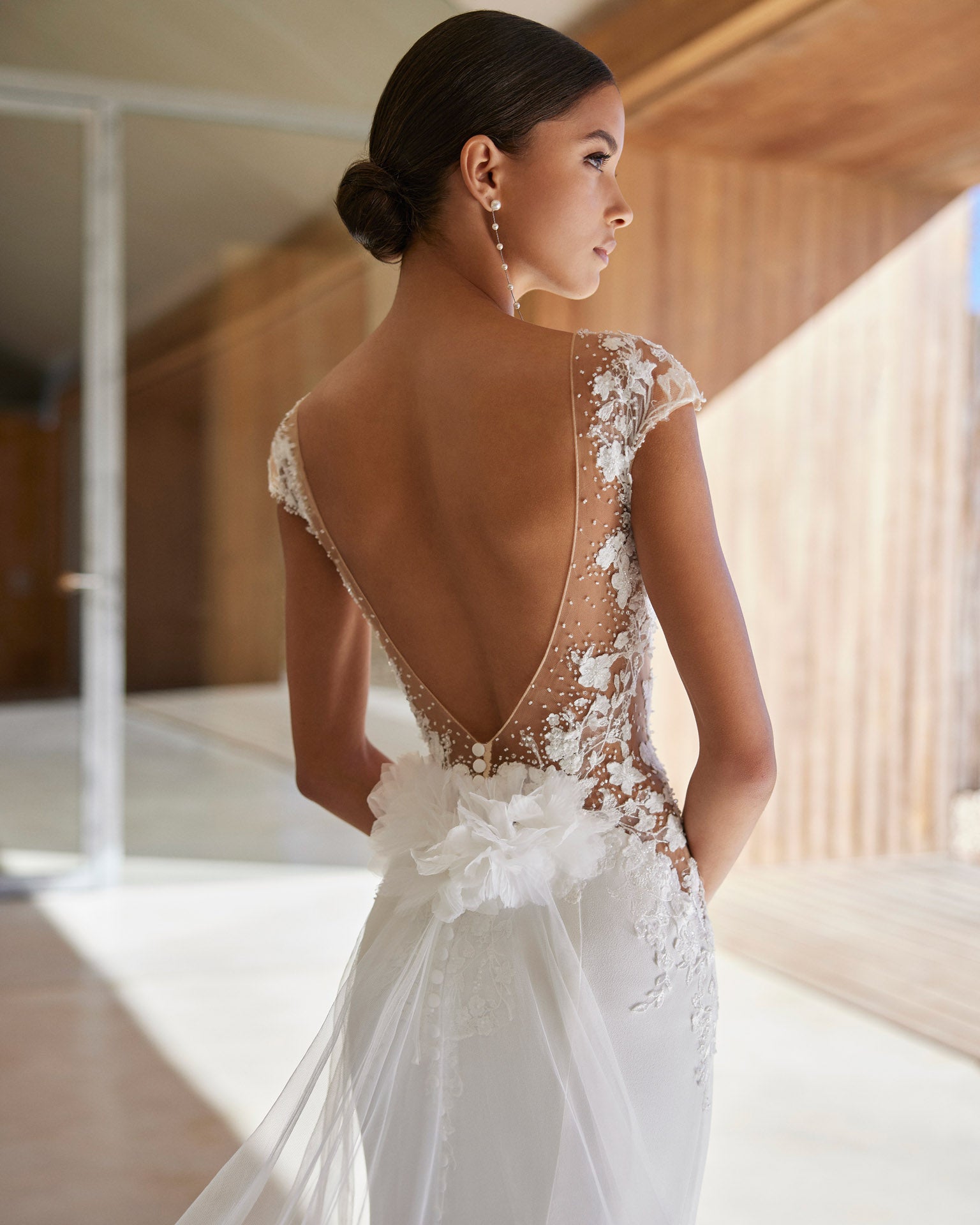 Make an unforgettable entrance in the Rosa Clará Aldane, a breathtaking two-piece mermaid wedding gown crafted in stretch crêpe with exquisite lace and beadwork. This modern yet romantic design highlights your silhouette while offering timeless bridal elegance.