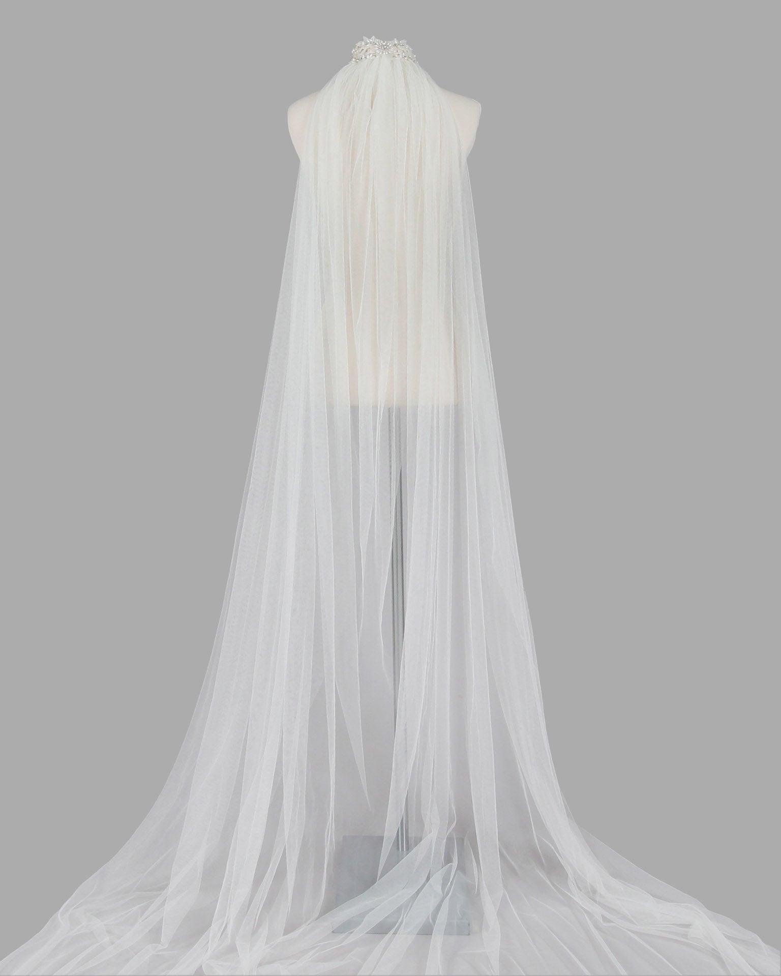 Pairs beautifully with minimalist crepe gowns, structured silhouettes, or dresses with subtle embellishment. Ideal for cathedral or formal ceremonies where drama meets refinement.