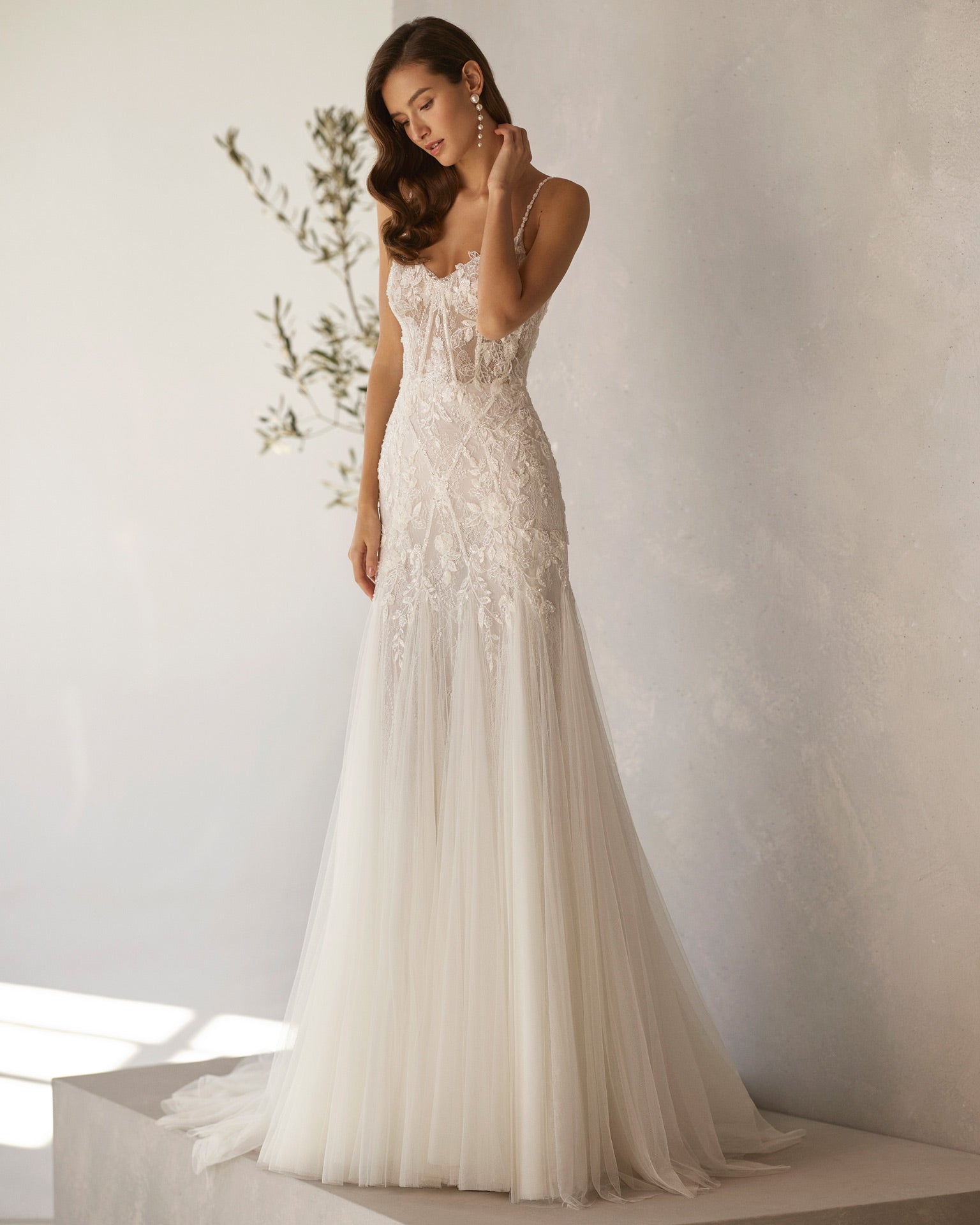 The Rosa Clará Caitlin gown is a sensual and sophisticated bridal design from the Soft collection. This long mermaid-style wedding dress is exquisitely crafted in lace and beadwork, highlighting every curve with elegance. Featuring a daring neckline, delicate straps, and a plunging back, this gown is designed to captivate from every angle. The perfect choice for brides seeking romance with a modern, refined edge.