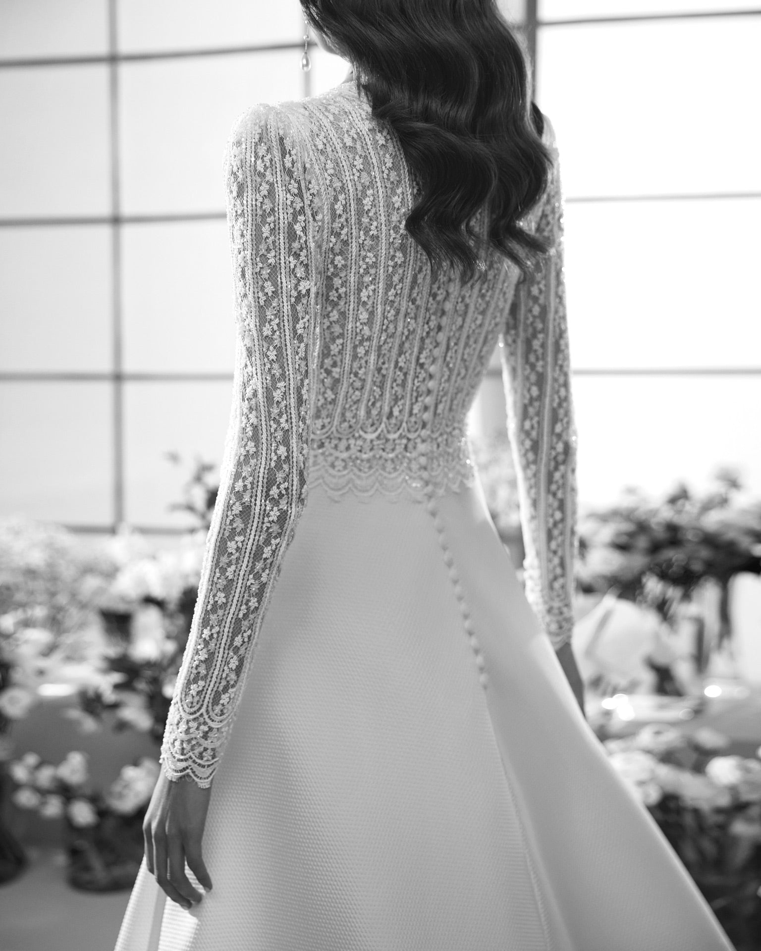 Marea wedding gown by Rosa Clará Couture. This haute couture design blends romantic artistry with modern sophistication, making it a breathtaking choice for your wedding day. The gown features a princess-style A-line silhouette, crafted in luxurious lace, beadwork, and Amalfi fabric. A delicate plunging neckline balances the modesty of its closed back and long lace sleeves, while the scalloped detailing and intricate embroidery highlight its couture craftsmanship. The flowing skirt is both dramatic and practical, complete with hidden pockets for a modern bride’s ease. A true statement of bridal couture, the Marea gown ensures a flawless fit and regal presence, designed for the bride who desires elegance with a touch of modern refinement.