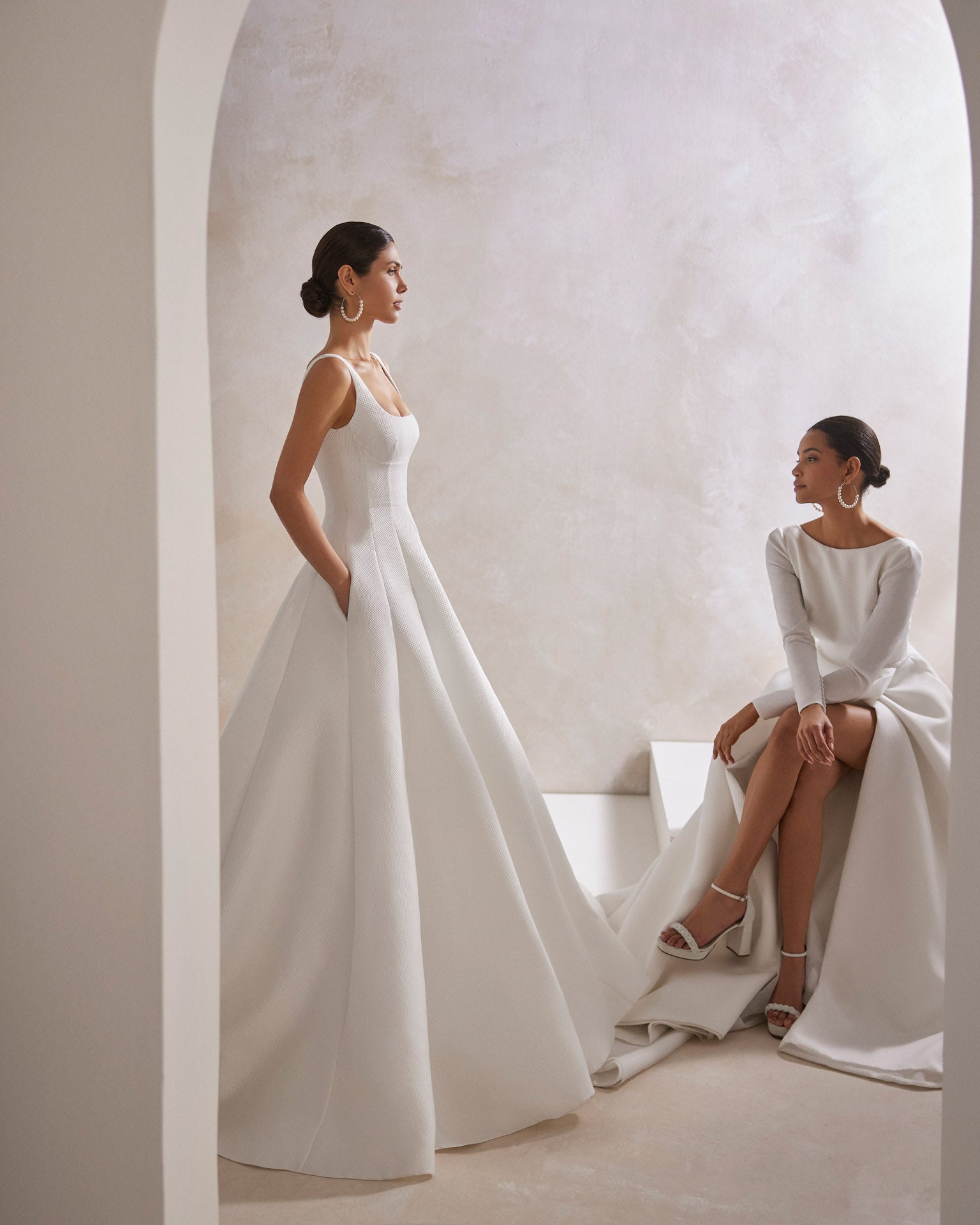 The Tosca gown from Rosa Clará Couture is an exquisite choice for the modern bride seeking timeless elegance. Crafted in luxurious cloqué fabric, this haute couture princess-style wedding dress features a structured square neckline, delicate straps, and a striking open back. The tailored seams flow seamlessly into a full skirt, creating a flattering silhouette with graceful volume. Perfect for brides who want sophistication with a contemporary edge, the Tosca gown embodies Rosa Clará’s signature craftsmanship and refined design.