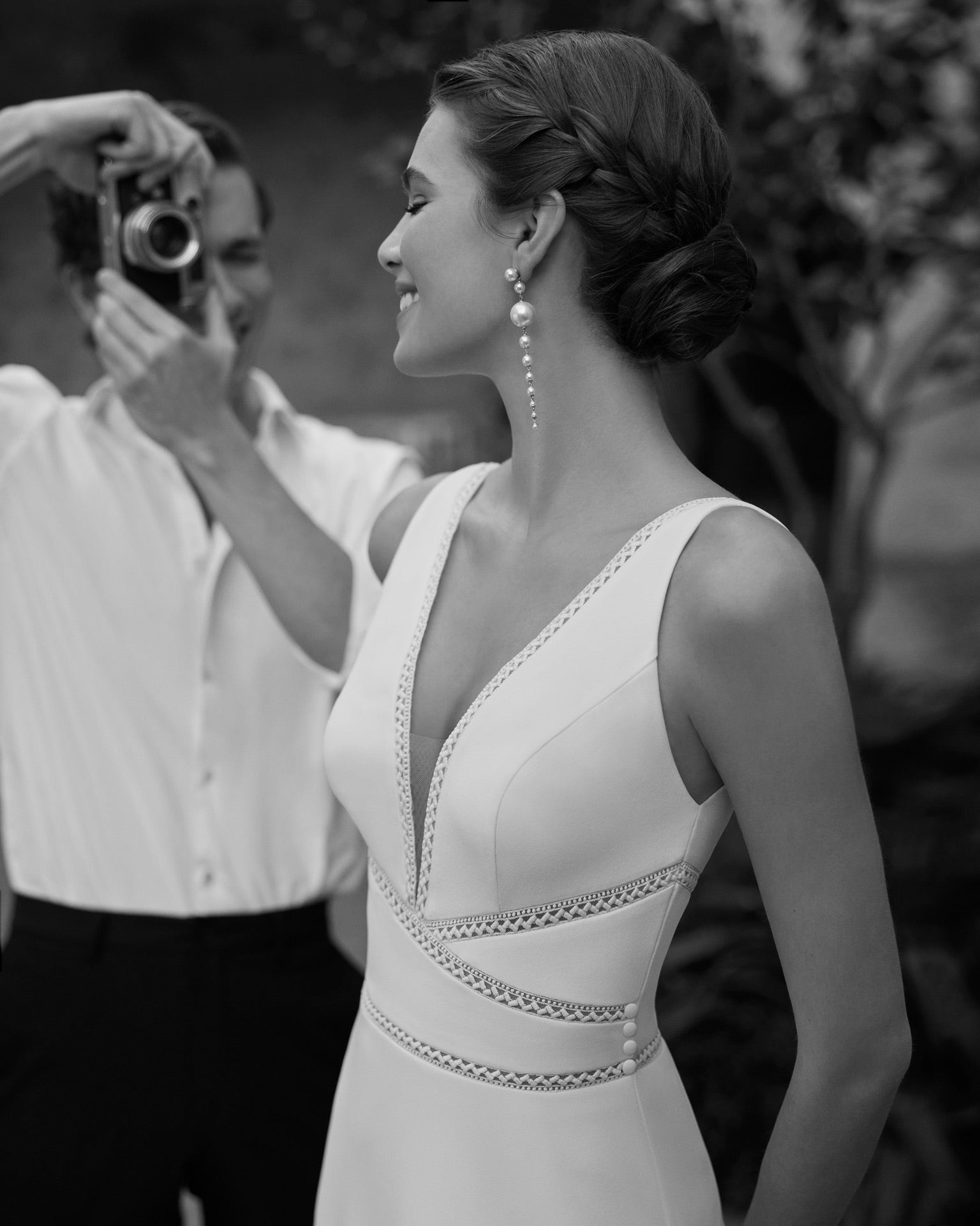 The Dalina gown by Rosa Clará is a timelessly elegant sheath-style wedding dress crafted in luxurious stretch crêpe. Its clean, flowing lines highlight the body with sophistication, while the plunging V-neckline and open V-back add modern allure. Subtle seam details and a graceful chapel-length train complete this Rosa Clará Boheme design, perfect for the bride seeking understated elegance with a refined finish.