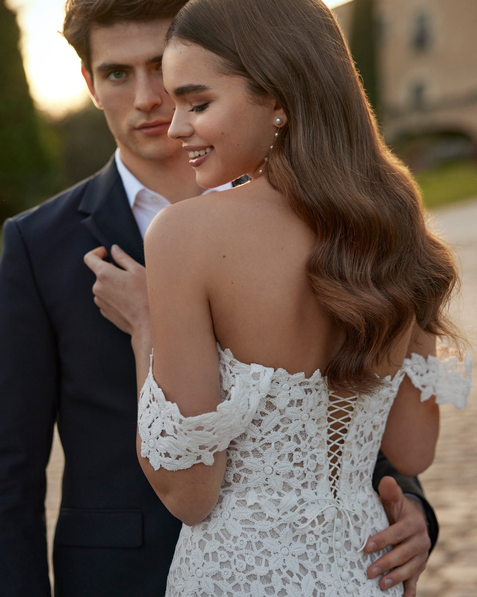 Romantic and effortlessly bohemian, the Rosa Clará Gerald gown is crafted in delicate guipure lace for a dreamy, textured finish. This long sheath-style wedding dress features a flattering strapless neckline with optional off-shoulder straps, creating a soft and feminine silhouette. The corset back adds structure and definition, while the graceful floor-length skirt ensures a timeless, boho-inspired bridal look.