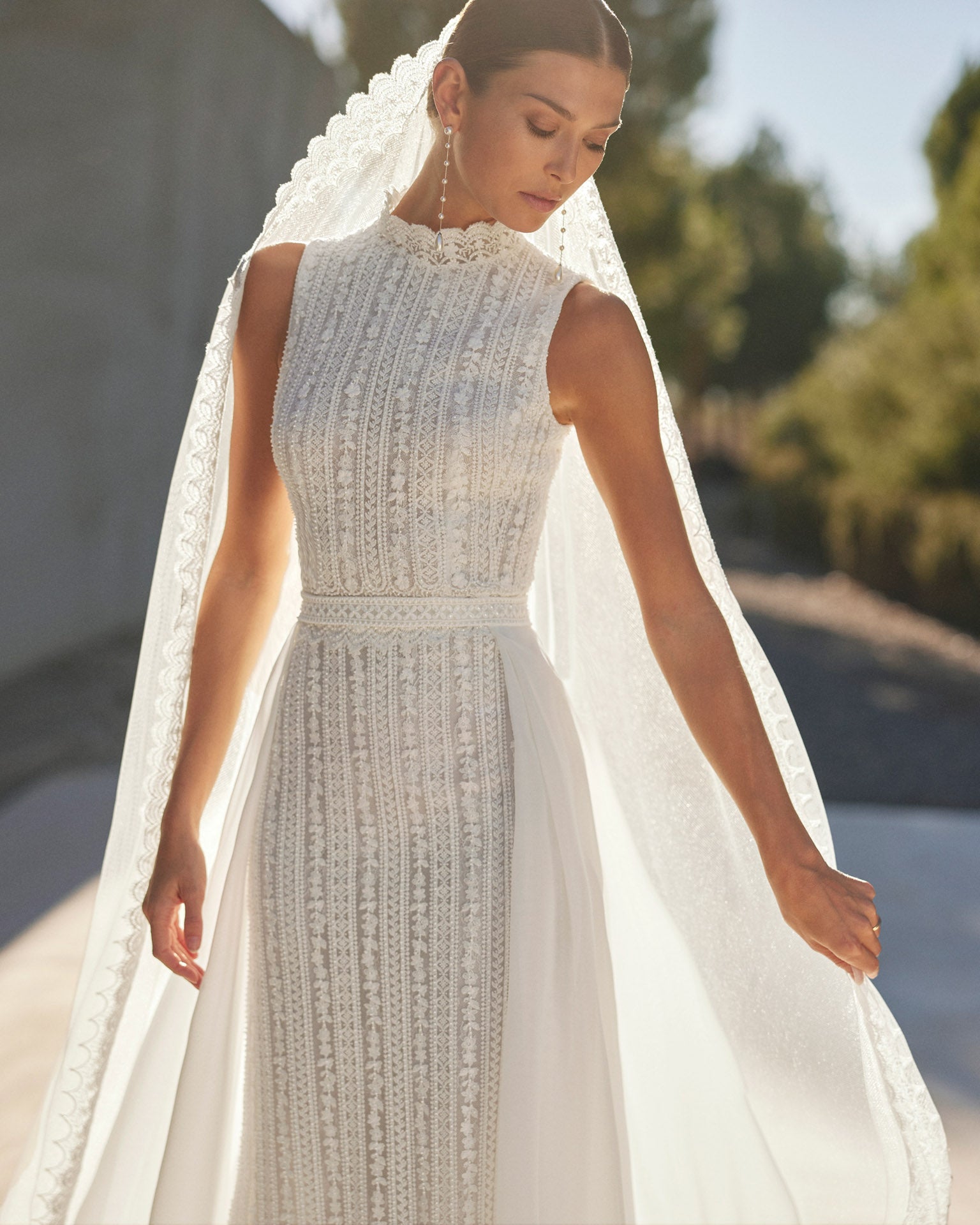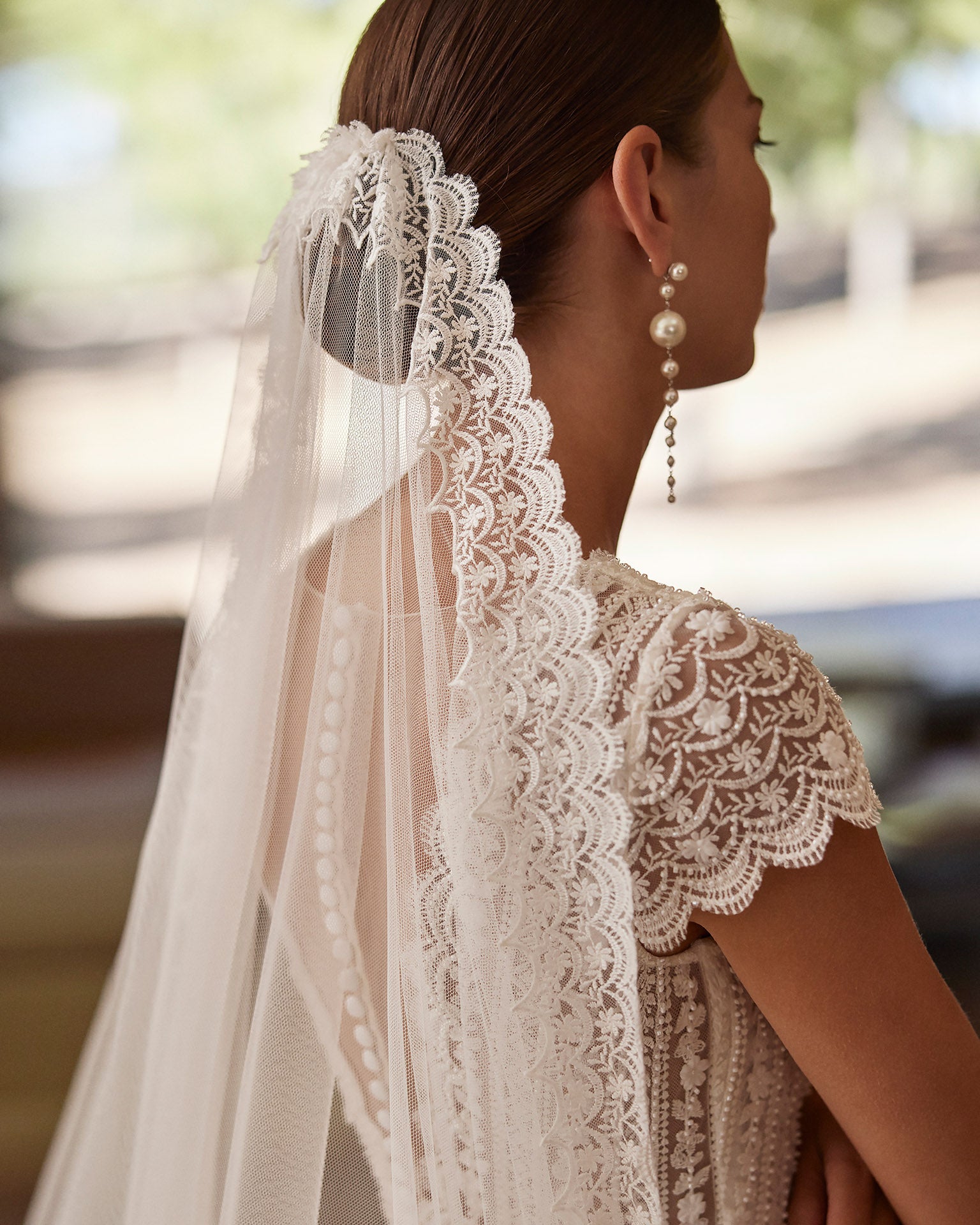 This veil captures everything we love about Rosa Clará: timeless beauty, fine craftsmanship, and a whisper of modern grace. The pearl and lace detailing frames the face beautifully and completes your look with effortless refinement.