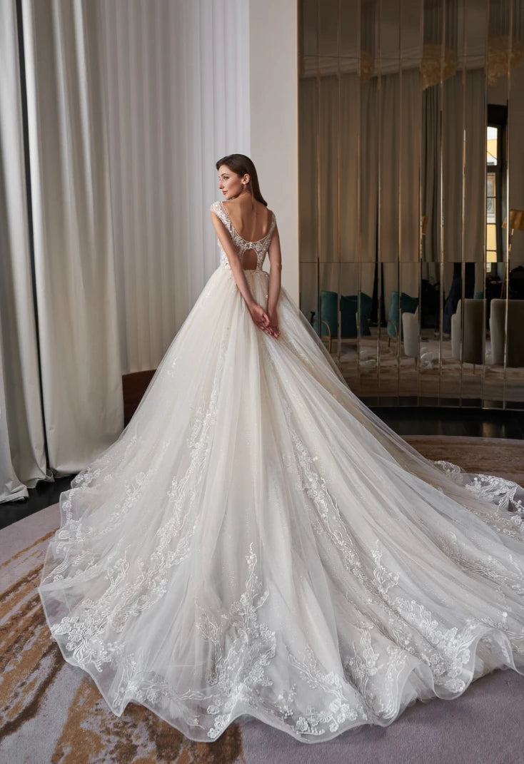 • Skirt: Layered glitter tulle with lace hem and chapel train