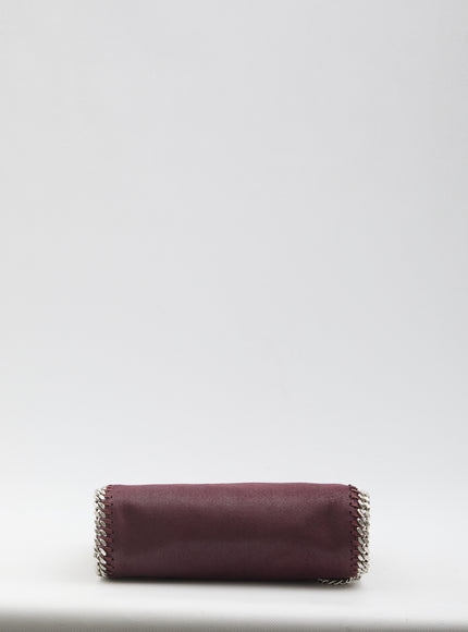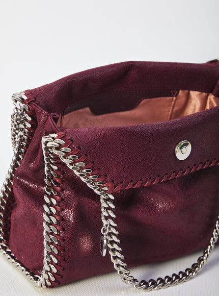 Stella Mccartney Mini Falabella tote bag in plum-colored faux Shaggy Deer fabric. It boasts diamond-cut silver-tone chain accents, two top handles, a shoulder strap, magnetic closure, one large internal compartment, and an internal flat pocket. Dust bag included.