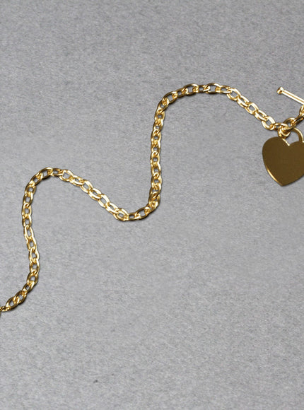 A classic link bracelet with toggle ends crafted in 14k yellow gold and featuring a dangling heart charm.