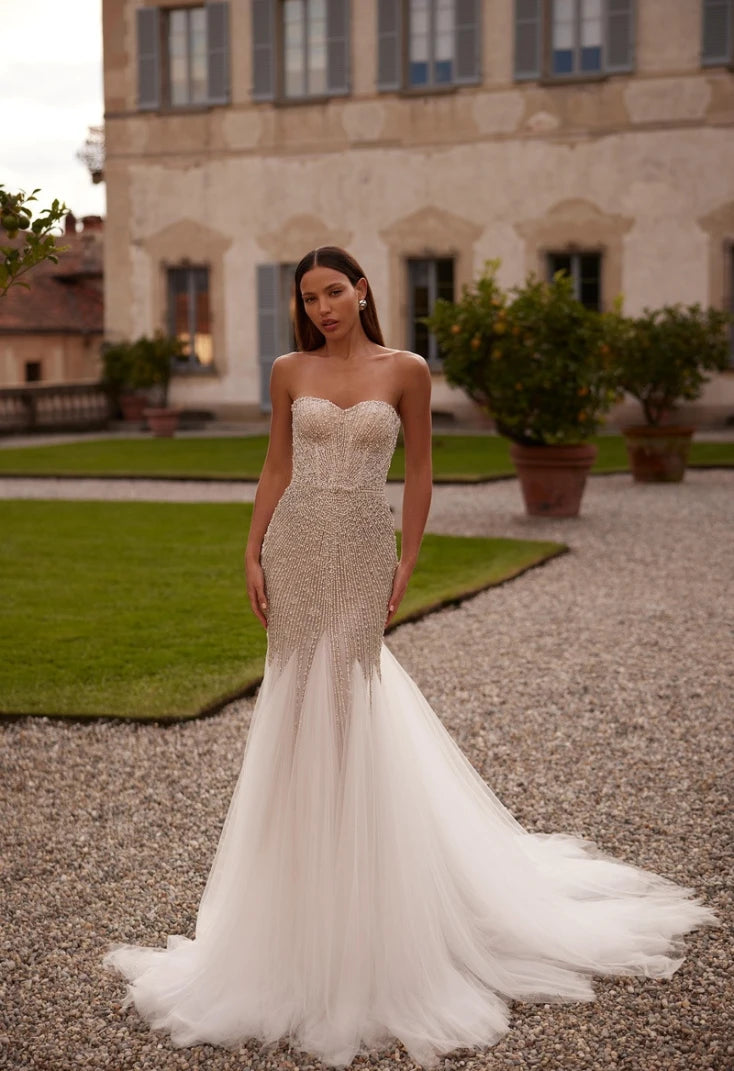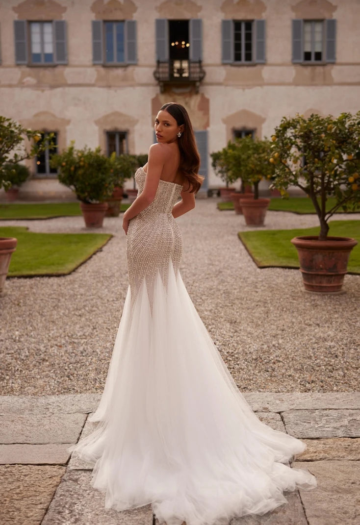 A breathtaking mermaid wedding gown in ivory, Valencia is designed to make every bride shimmer with brilliance. The semi-transparent corset features a romantic sweetheart neckline, intricately adorned with diagonal lines of pearls and crystals that catch the light like cascading stars. The fitted bodice and hips contour the figure before flowing into a voluminous tulle skirt that radiates ethereal elegance. Every bead, every drape, and every line of embroidery comes together to create a gown that feels celestial.