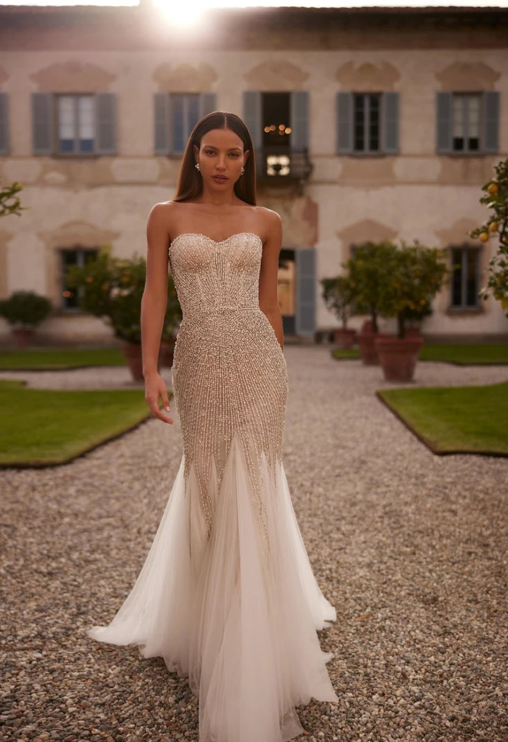 Valencia captures light like no other. Its beaded rays seem to dance across the gown, creating a subtle sparkle that glows from every angle—whether under daylight or candlelight. It’s both modern and timeless, with the perfect balance of glamour and refinement. This gown transforms every step into a moment of starlight.