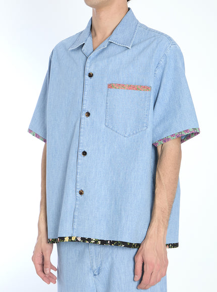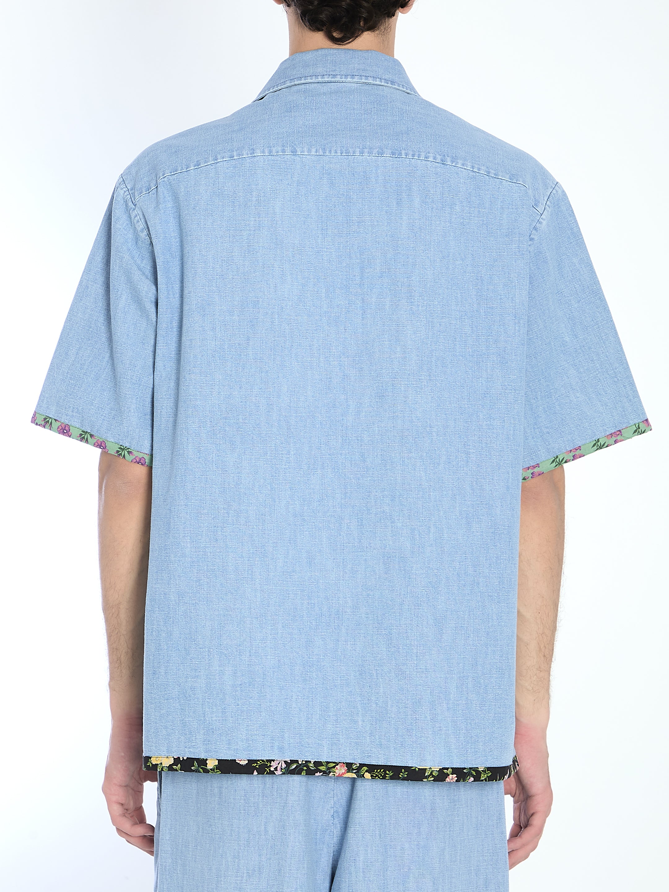 Short-sleeved shirt in light blue cotton denim with floral print trim. It features an open collar and front button closure.