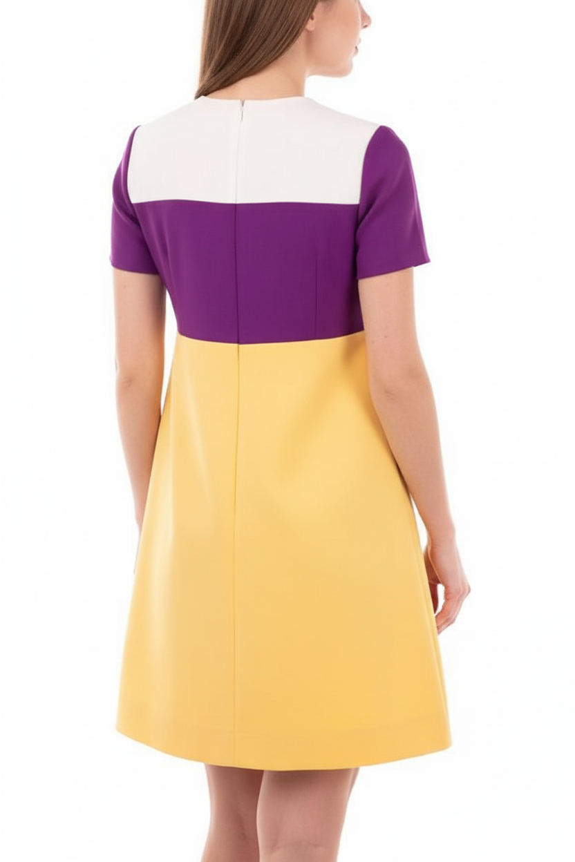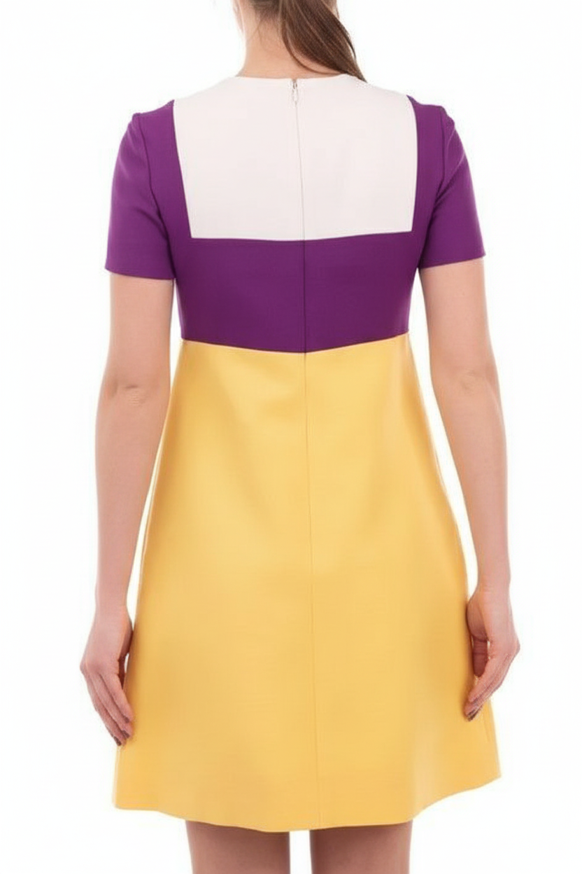 This Valentino Silk & Wool Mini Trapeze Dress is a size 40 / S and features a Color Block pattern. Its 100% Silk lining and inverted pleat accents add to its sophisticated design. The dress has a crew neckline, short sleeves, and a zip closure, with 2 hand pockets for added convenience. Made in Italy from a luxurious blend of 68% Wool and 32% Silk, it is recommended to dry-clean only. Please note that any streaks in the fabric are natural characteristics, ensuring purity. The model pictured is 5'9" (175 cm), weighs 123lbs (56 kg), and is wearing a size 40.